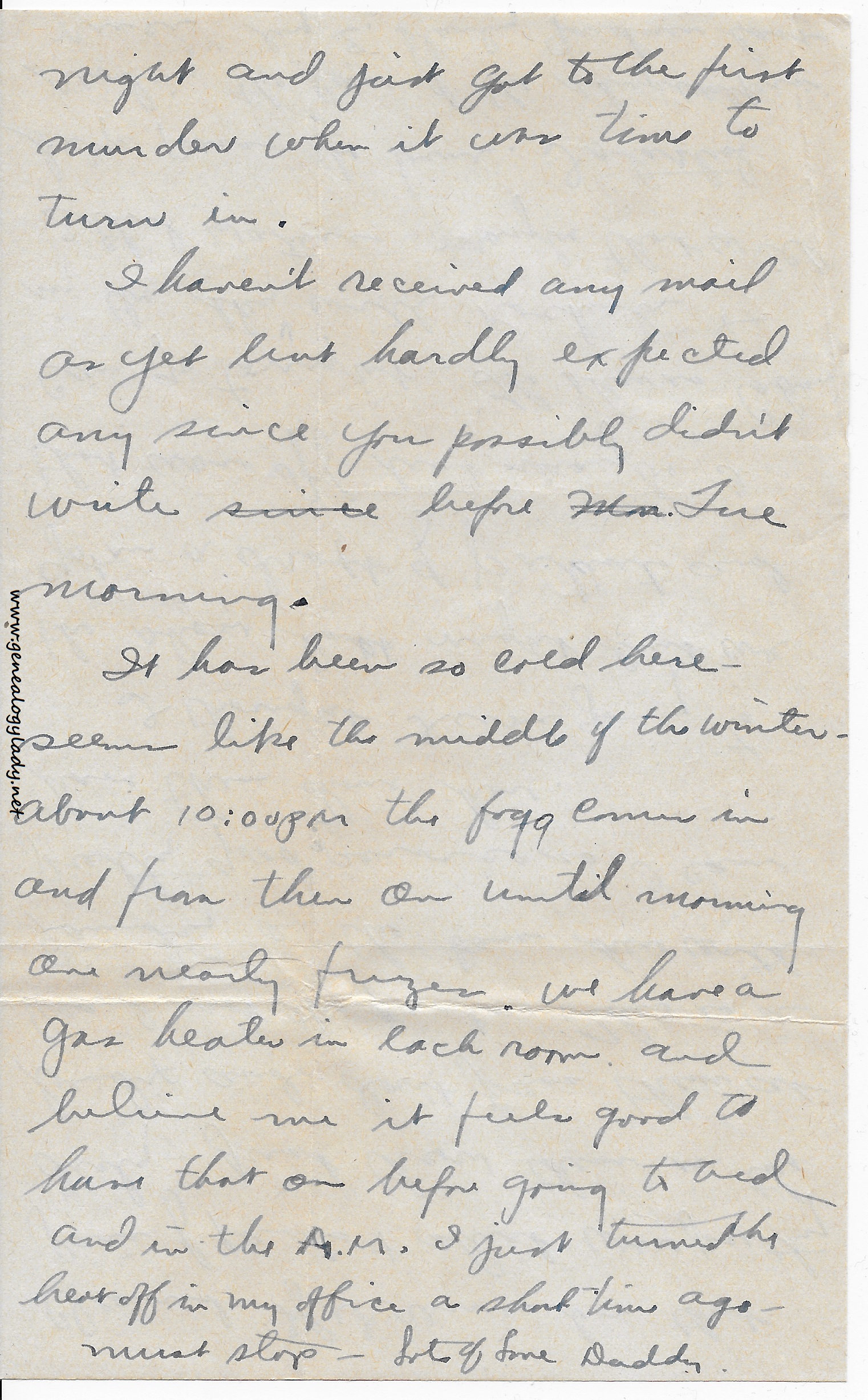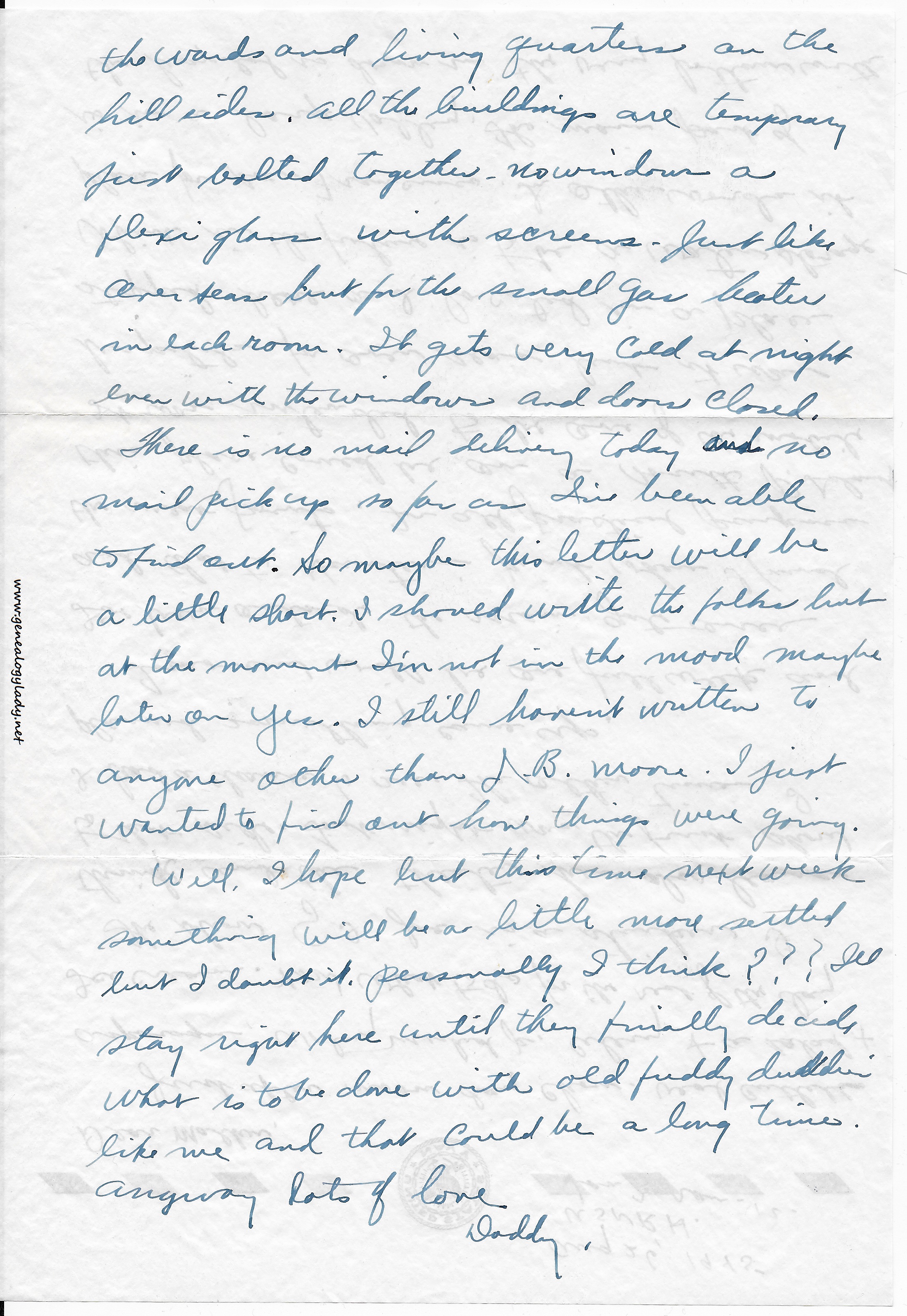 [page 4] and that cold wind sure keeps the lower part of the room in a semi frigid condition. There was an earthquake this AM at 6 but it didn’t seem to disturb me. So far as I know it was just a little wriggle – like Jello in a little dish. Maybe it was the Yanks taking the nips.