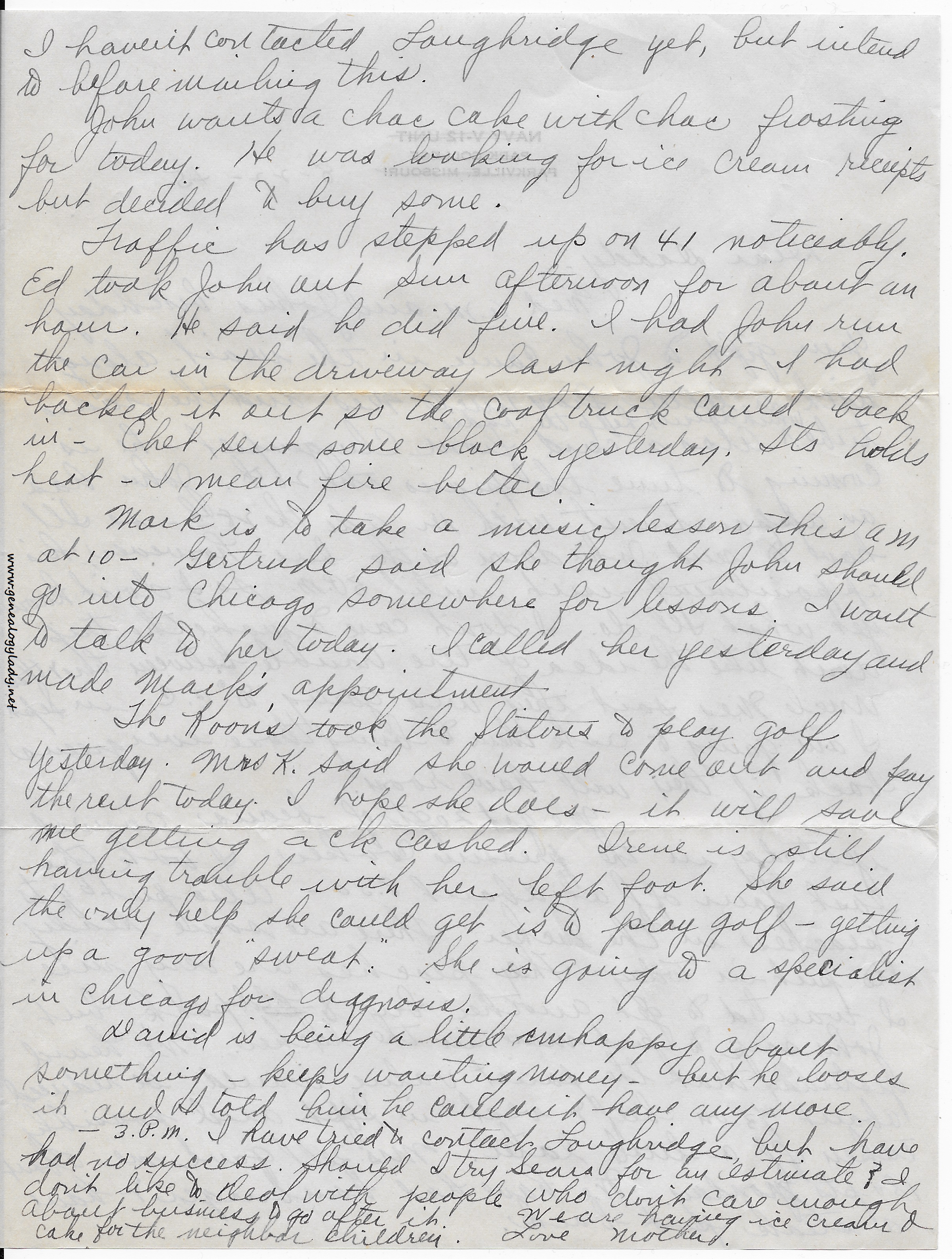 Marjory Harris had surgery on her back (removal of a disc) and the bunions taken off her feet. I took her some things for her dinner this afternoon. She can’t be on her feet very long. If she does, her feet swell and turn purple, so she has to sit most of the time. I had cooked a chicken with carrots & celery (one of Dad’s favorite dishes) this morning – so this afternoon I took some chicken, carrots & celery, and a cheese cake to her. She said her appetite wasn’t very good but called me this evening and said she had eaten and evidently with more appetite than usual.