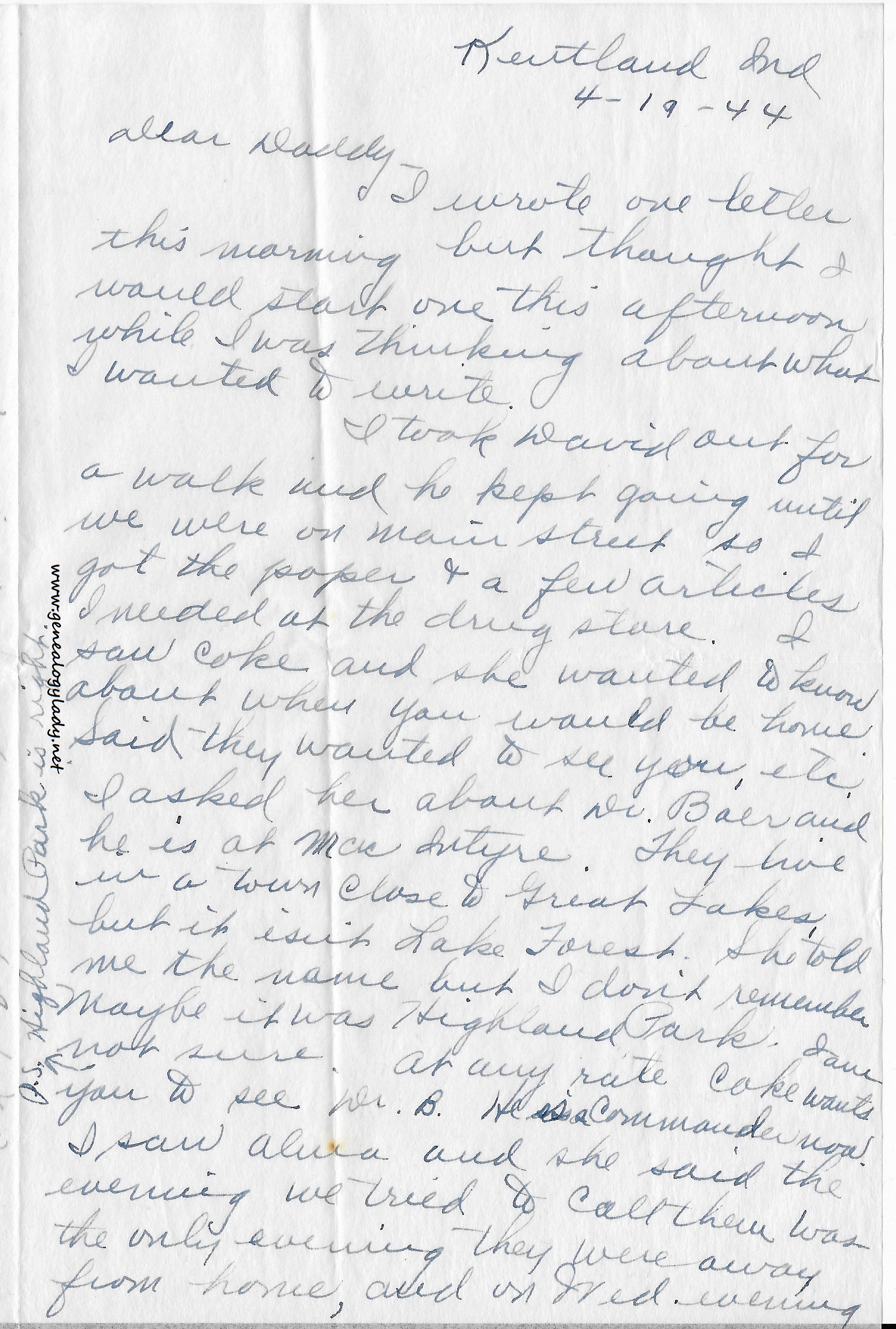 I took David out for a walk and he kept going until we were on Main street so I got the paper & a few articles I needed at the drug store. I saw Coke and she wanted to know about when you would be home. Said they wanted to see you, etc. I asked her about Dr. Baer and he is a MacIntyre. They live in a town close to Great Lakes, but it isn’t Lake Forest. She told me the name but I don’t remember. Maybe it was Highland Park. I am not sure. At any rate coke wants you to see Dr. B. He is a Commander now. I saw Alma and she said the evening we tried to call them was the only evening they were away from home, and on Wed. evening