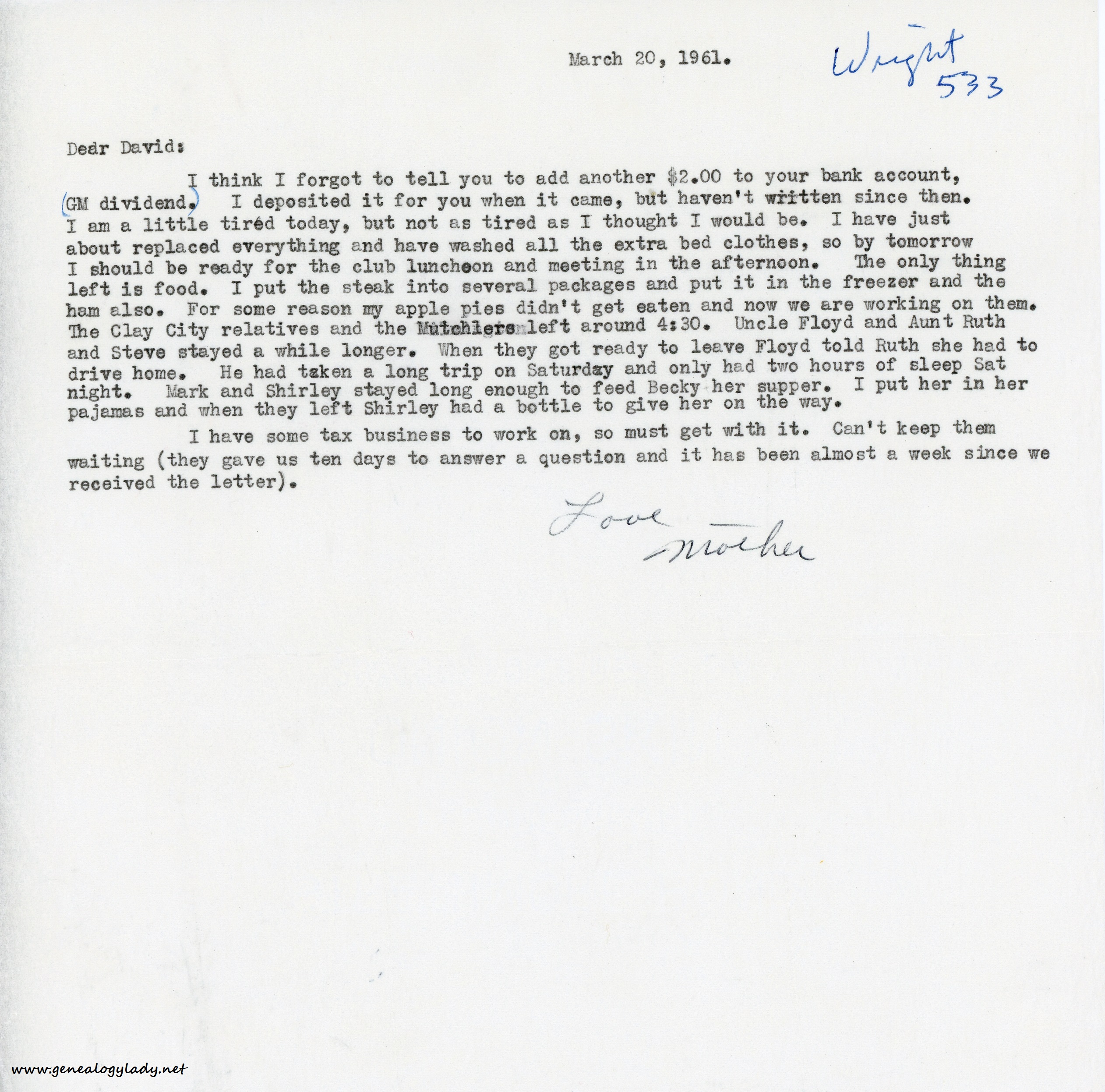 I think I forgot to tell you to add another $2.00 to your bank account, (GM dividend). I deposited it for you when it came, but haven’t written since then. I am a little tired today, but not as tired as I thought I would be. I have just about replaced everything and have washed all the extra bed clothes, so by tomorrow I should be ready for the club luncheon and meeting in the afternoon. The only thing left is food. I put the steak into several packages and put it in the freezer and the ham also. For some reason my apple pies didn’t get eaten and now we are working on them. The Clay City relatives and the Mutchlers left around 4:30. Uncle Floyd and Aunt Ruth and Steve stayed a while longer. When they got ready to leave Floyd told Ruth she had to drive home. He had taken a long trip on Saturday and only had two hours of sleep Sat. night. Mark and Shirley stayed long enough to feed Becky her supper. I put her in her pajamas and when they left Shirley had a bottle to give her on the way.