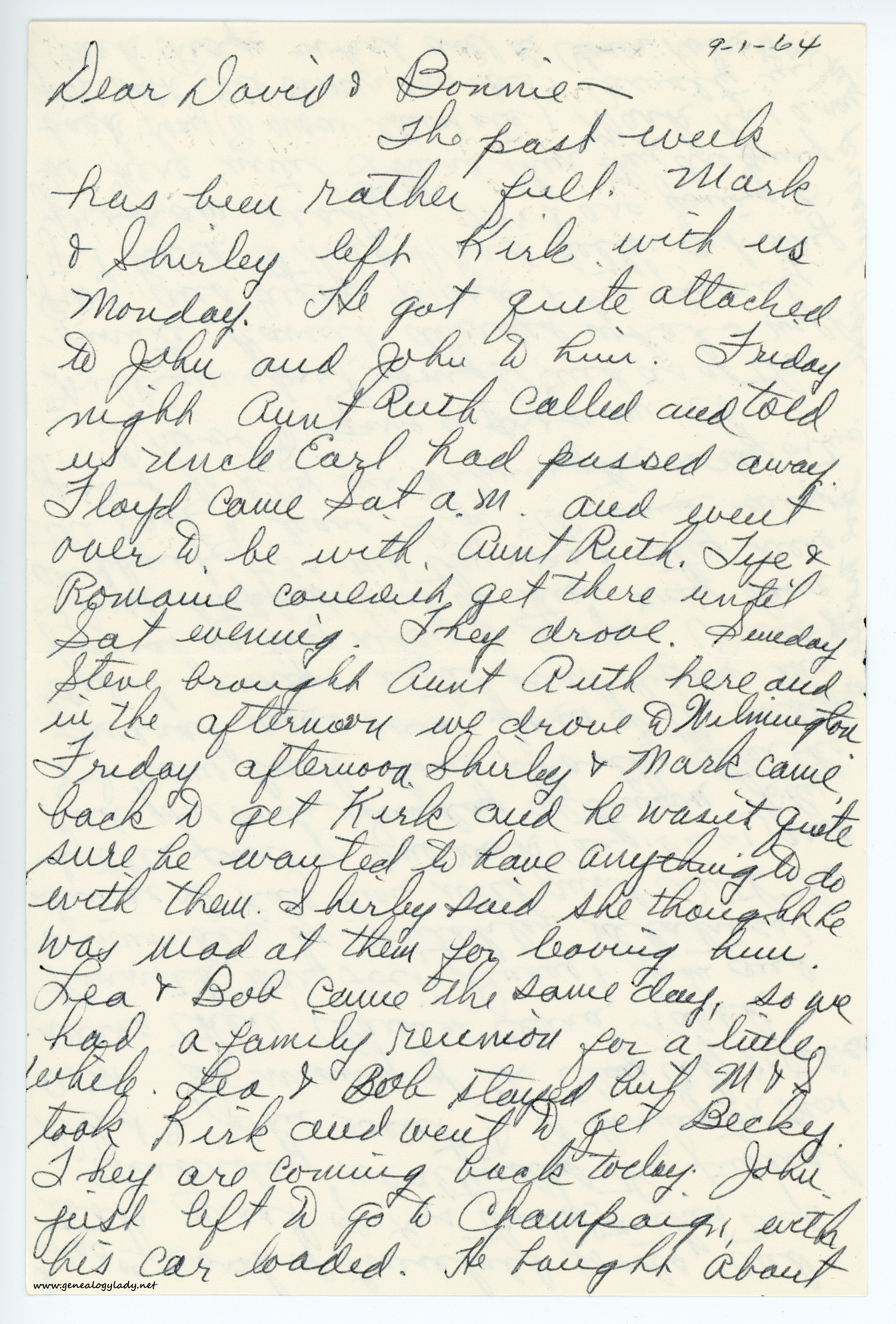 The past week has been rather full. Mark & Shirley left Kirk with us Monday. He got quite attached to John and John to him. Friday night Aunt Ruth called and told us Uncle Earl had passed away. Floyd came Sat. a.m. and went over to be with Aunt Ruth. Tye & Romaine couldn’t get there until Sat. evening. They drove. Sunday Steve brought Aunt Ruth here and in the afternoon we drove to Wilmington. Friday afternoon Shirley & Mark came back to get Kirk and he wasn’t quite sure he wanted to have anything to do with them. Shirley said she thought he was mad at them for leaving him. Lea & Bob came the same day, so we had a family reunion for a little while. Lea & Bob stayed but M. & S. took Kirk and went to get Becky. They are coming back today. John just left to go to Champaign with his car loaded. He bought about