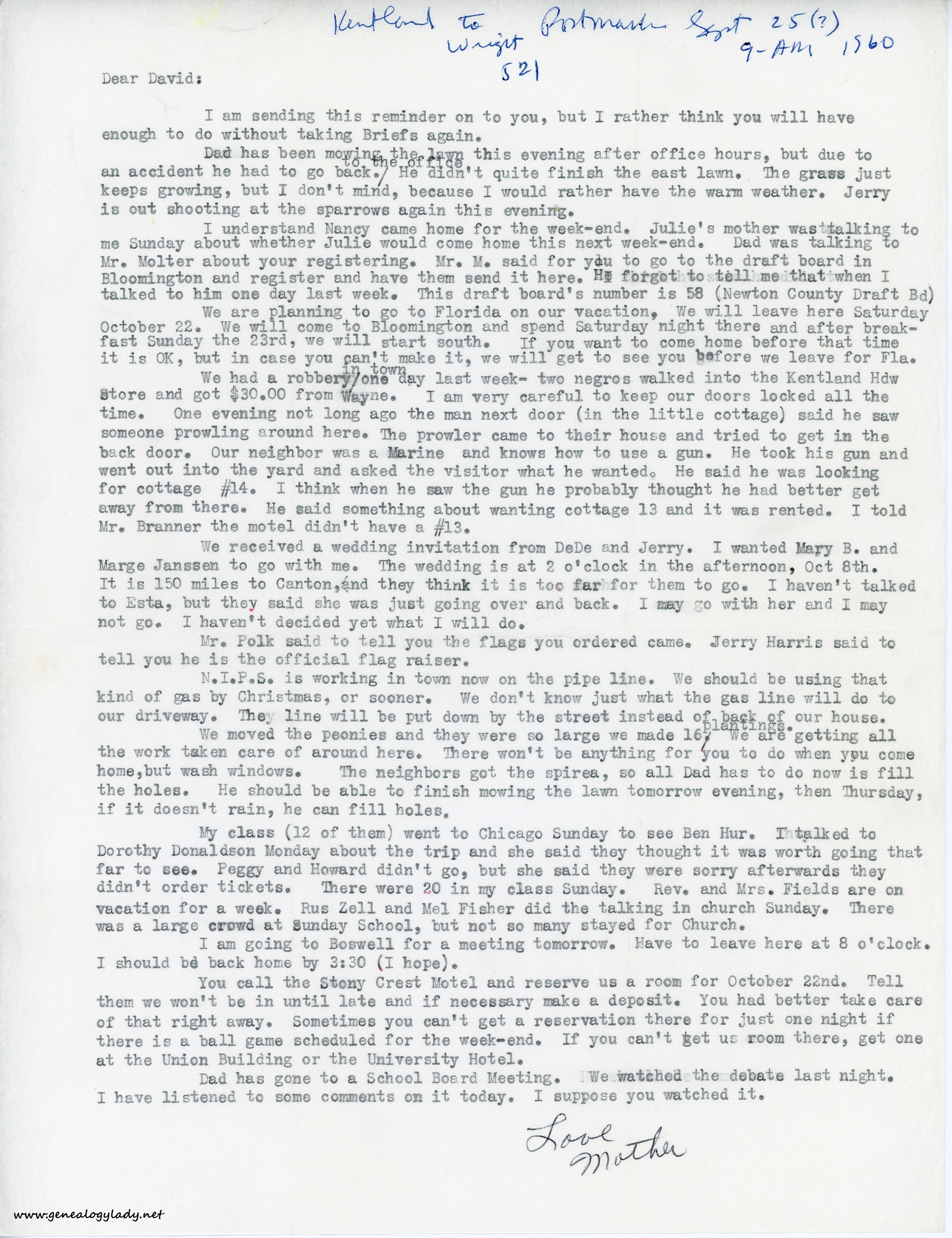 [Kentland to Wright 521 Postmark Sept. 25 (?) 9- AM 1960 – in David’s handwriting]