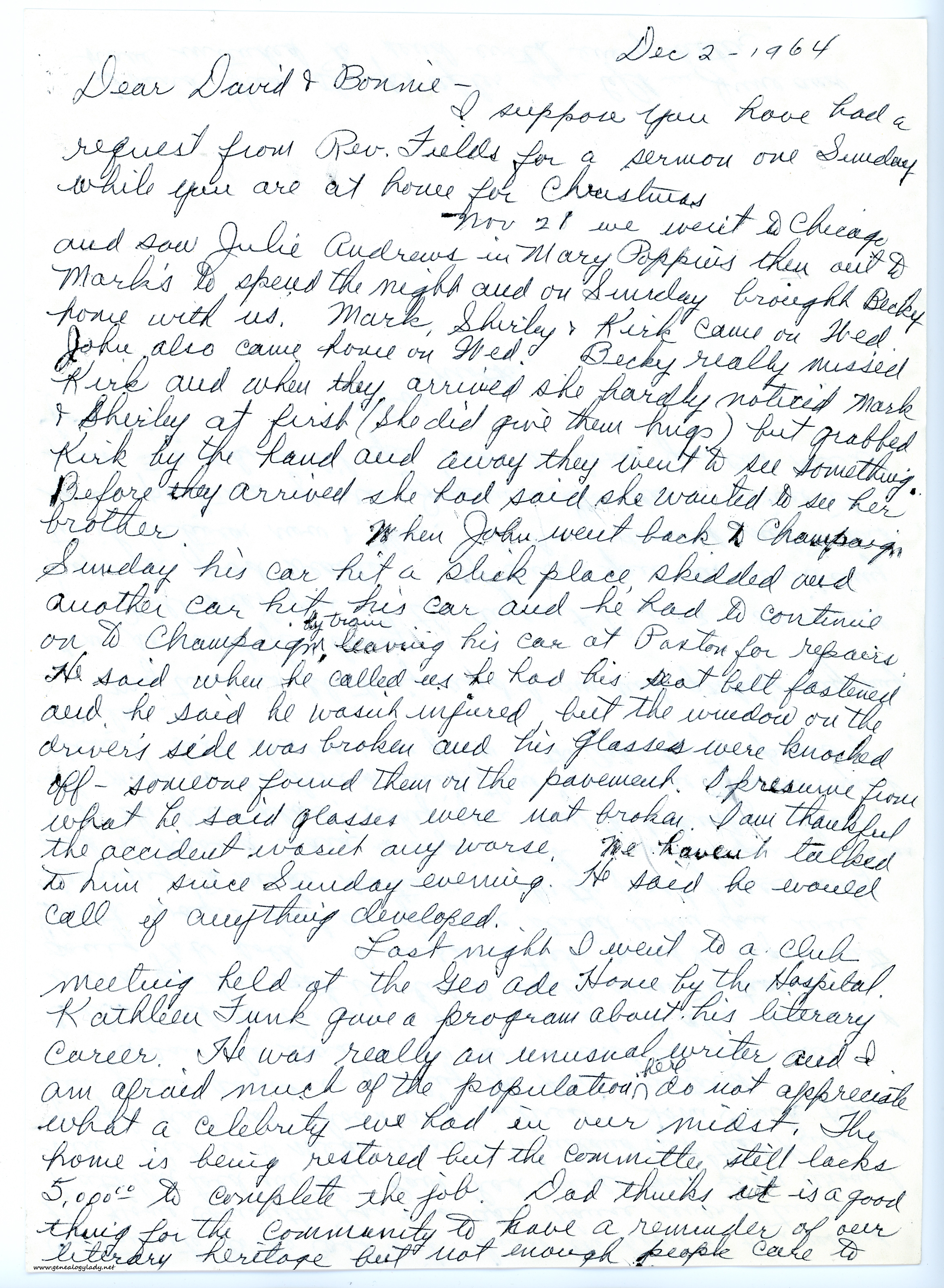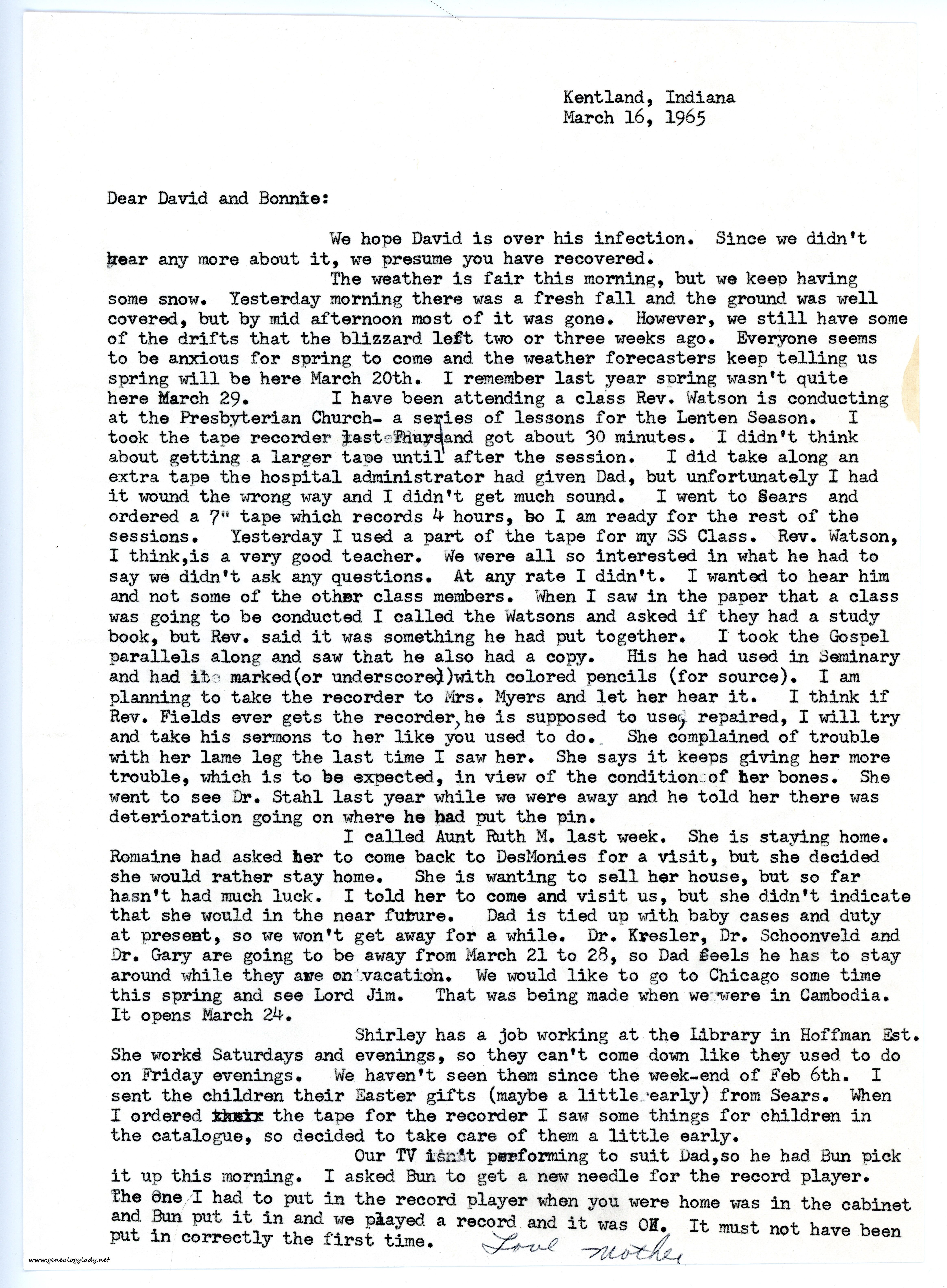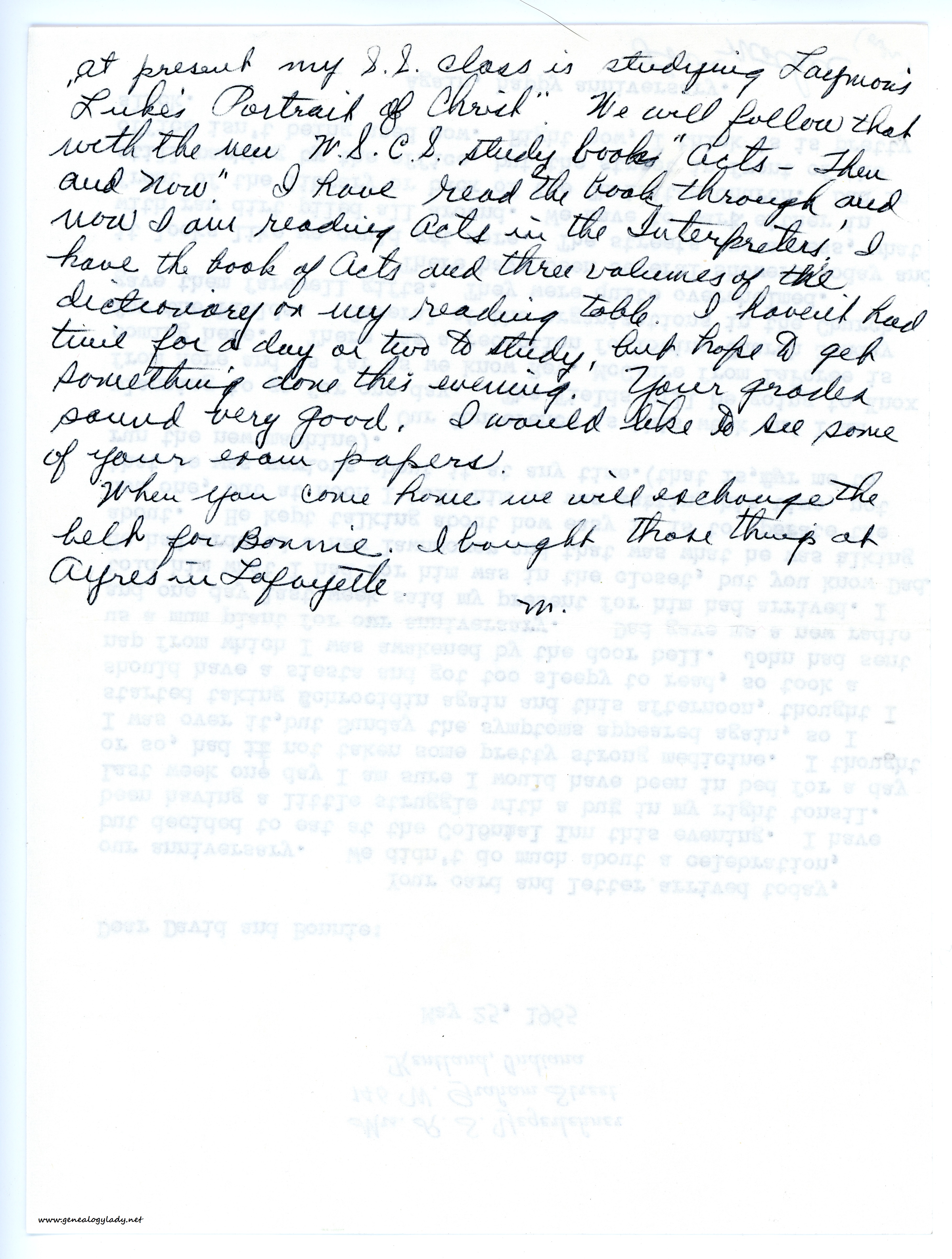 [page 2] Wednesday evening Jim & Thelma had dinner with us at the Athletic Club and we had planned to attend an affair planned for the Doctors and guests. When we got to the door we were told there were three tickets left. Since there were 4 of us, we went back to Jim & Thelma’s and showed them some of our pictures. They want us to come to Indianapolis and show pictures for their S.S. class next April. We promised we would. Aunt Thelma said they hadn’t sent you a wedding present yet. She intimated it would be $, which I presume will be acceptable at any time.