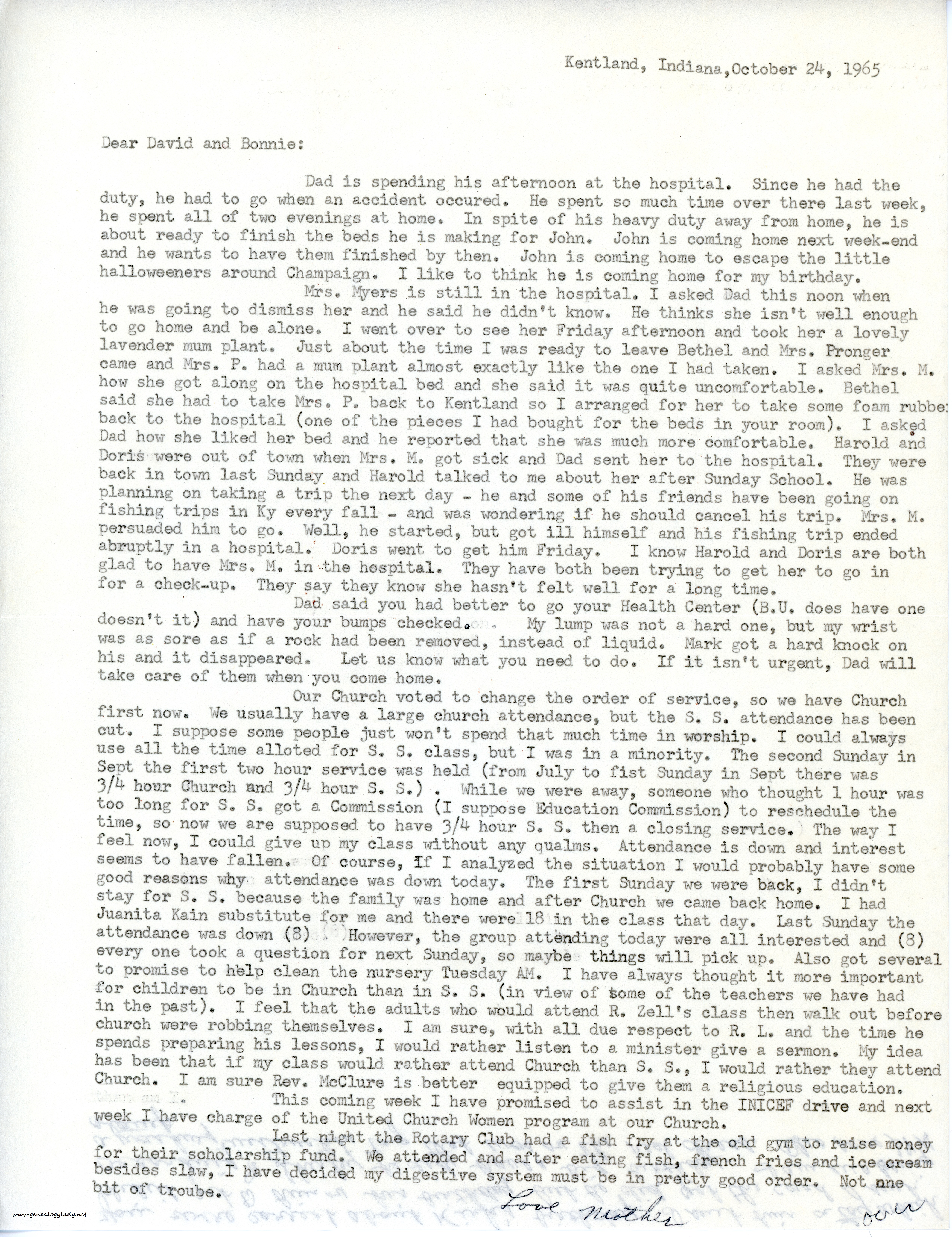 Last weekend we went to Centerville and had a very enjoyable visit with Louise and Mac. We also visited with Grandpa and Grandma. We both think it is remarkable the way Bonnie’s grandparents continue to be so well and active. We enjoyed a steamboat dinner and now Dad is trying to figure how he can make a steamboat. Knowing your Dad, you know he will get something produced in time. Today I attended a luncheon at the Union Building and a Layman’s meeting in Loeb’s Theatre. After the Layman’s meeting I came home, but saw Rev. McClure and a few other people in the lobby before leaving. This week Dad has been attending meetings and I have two more to attend (he has been going to dinner meetings) so we won’t get much done in the way of packing. We plan to go to Kentland Friday evening. He wants Dr. Logan to do some work on his teeth, and he plans to have office hours on Saturday. We plan to go to Danville and meet John, Lea and Bob at about 6:30 for a smorgasbord dinner, then on to John’s to spend the night. We plan to come back home Sunday evening.