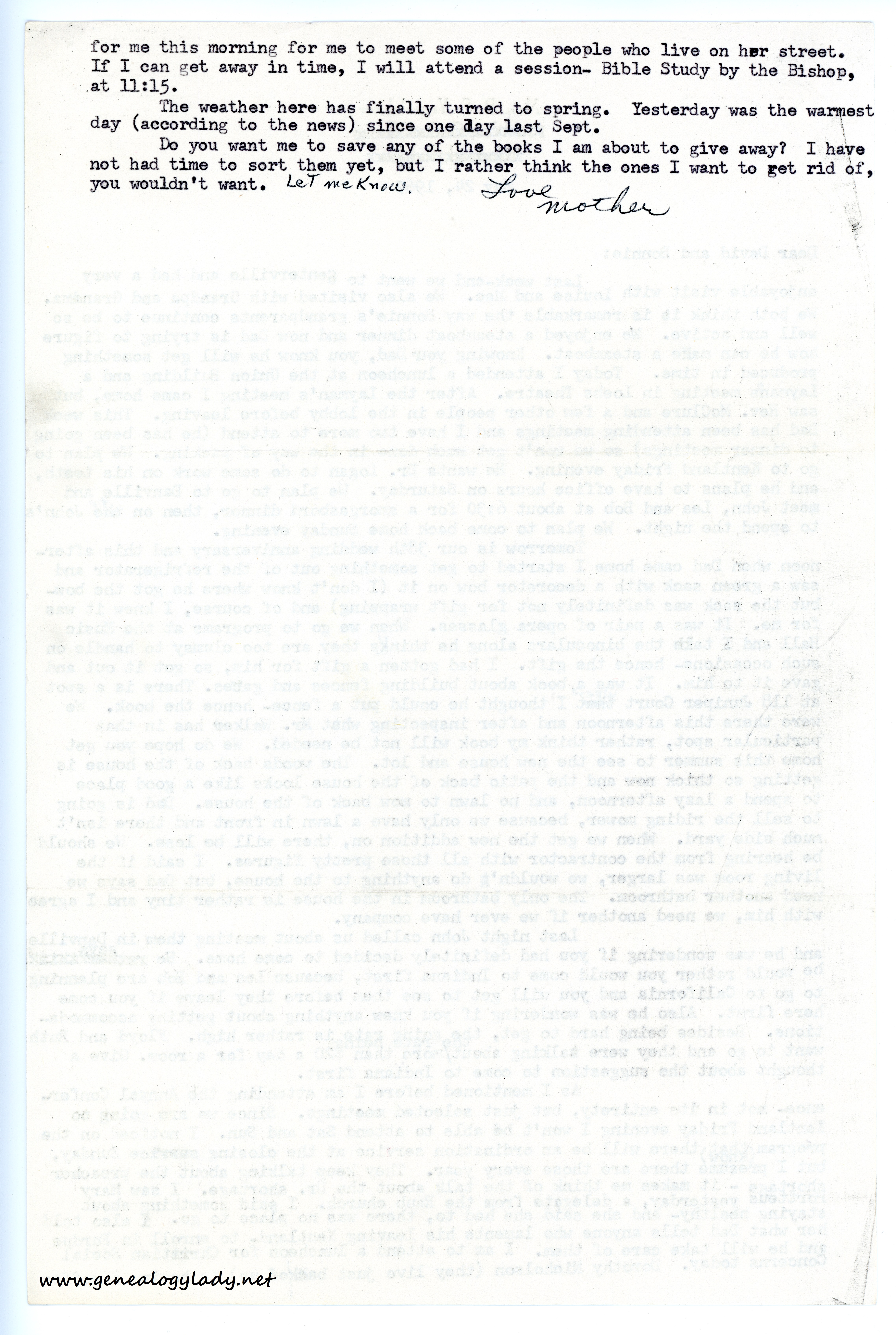 [page 2] for me this morning for me to meet some of the people who live on her street. If I can get away in time, I will attend a session – Bible Study by the Bishop, at 11:15.
