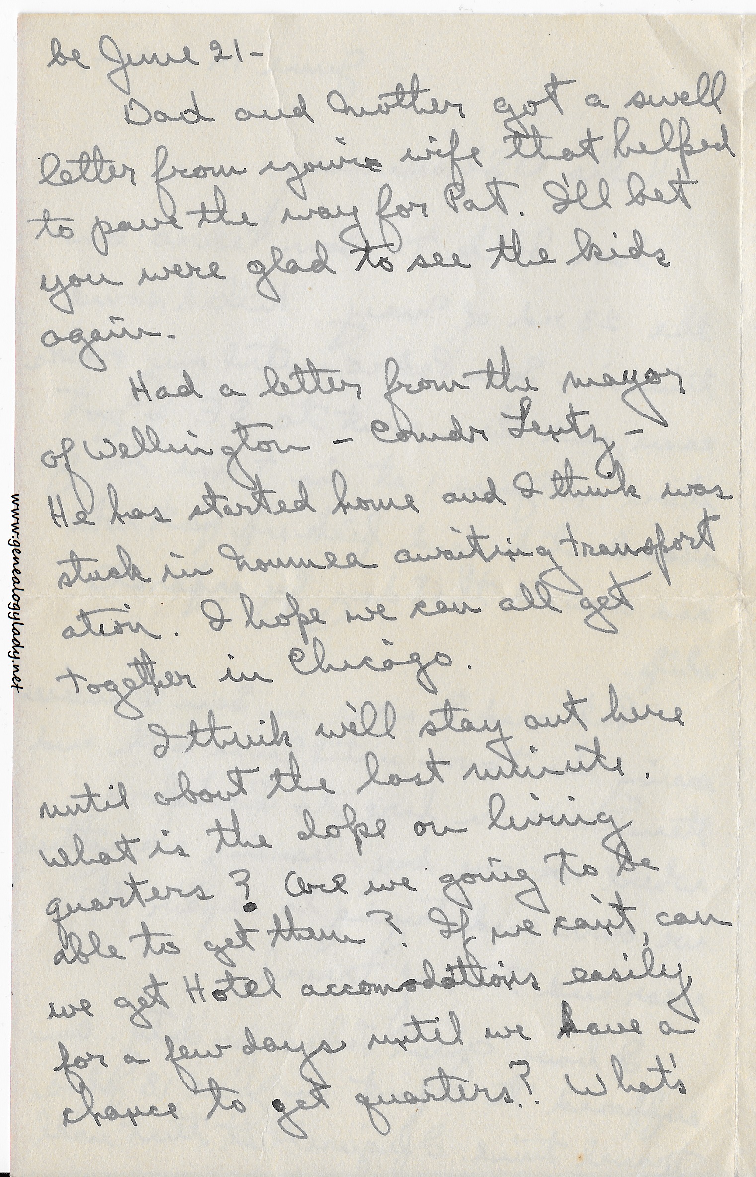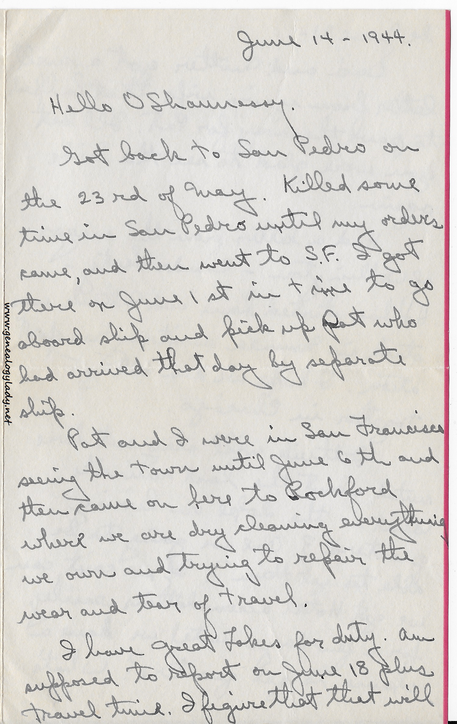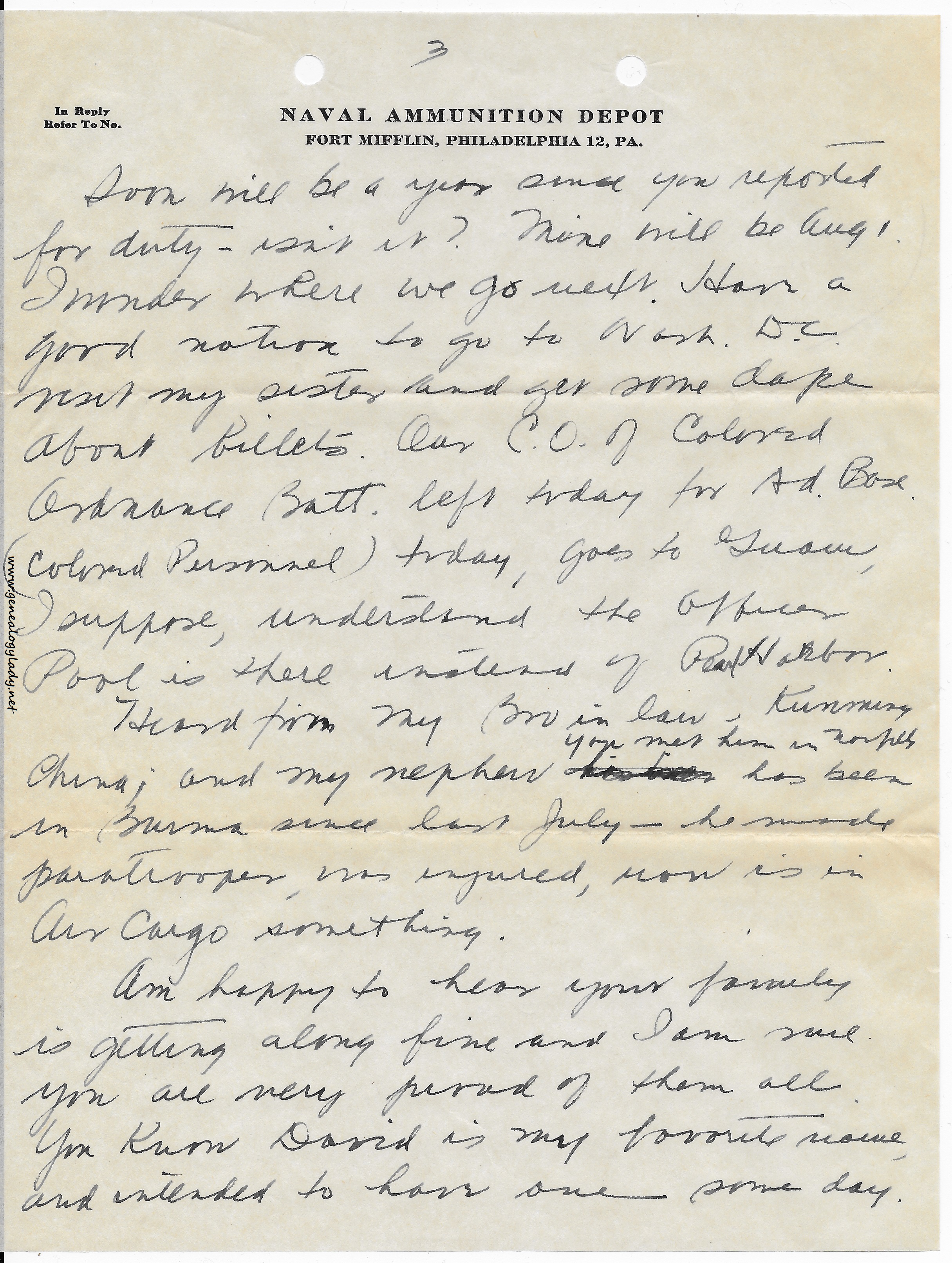 [page 3] Soon will be a year since you reported for duty – isn’t it? Mine will be Aug. 1. I wonder where we go next. Have a good notion to go to Wash., D.C., visit my sister and get some dope about billets. Our C.O. of Colored Ordnance Batt. left today for Ad. Base (Colored Personnel) today, goes to Guam, I suppose, understand the officer pool is there instead of Pearl Harbor.