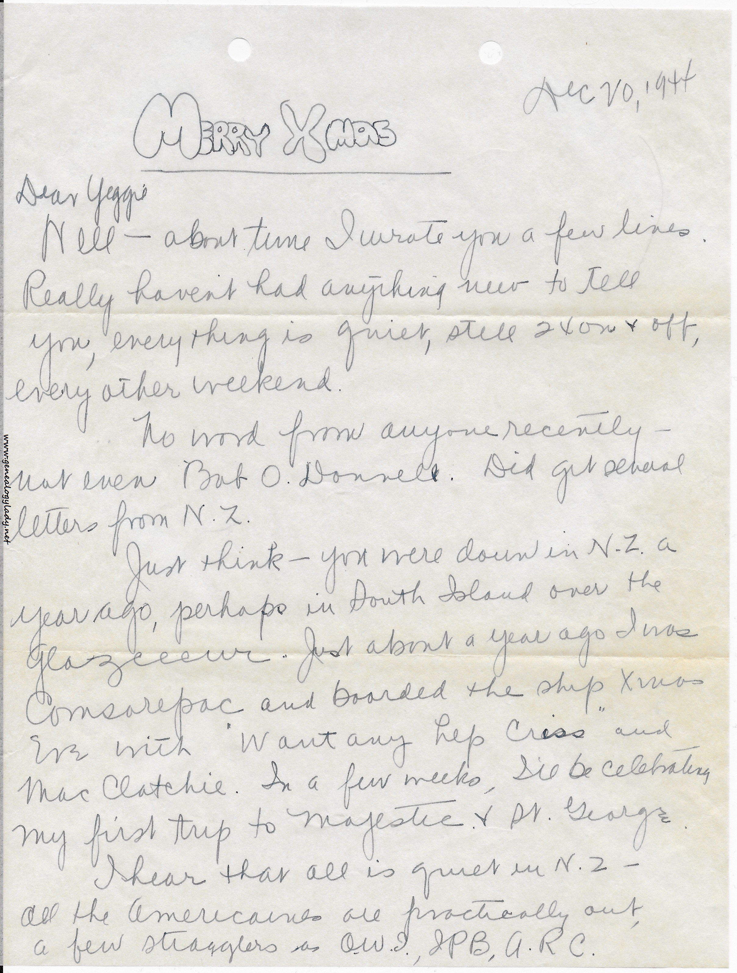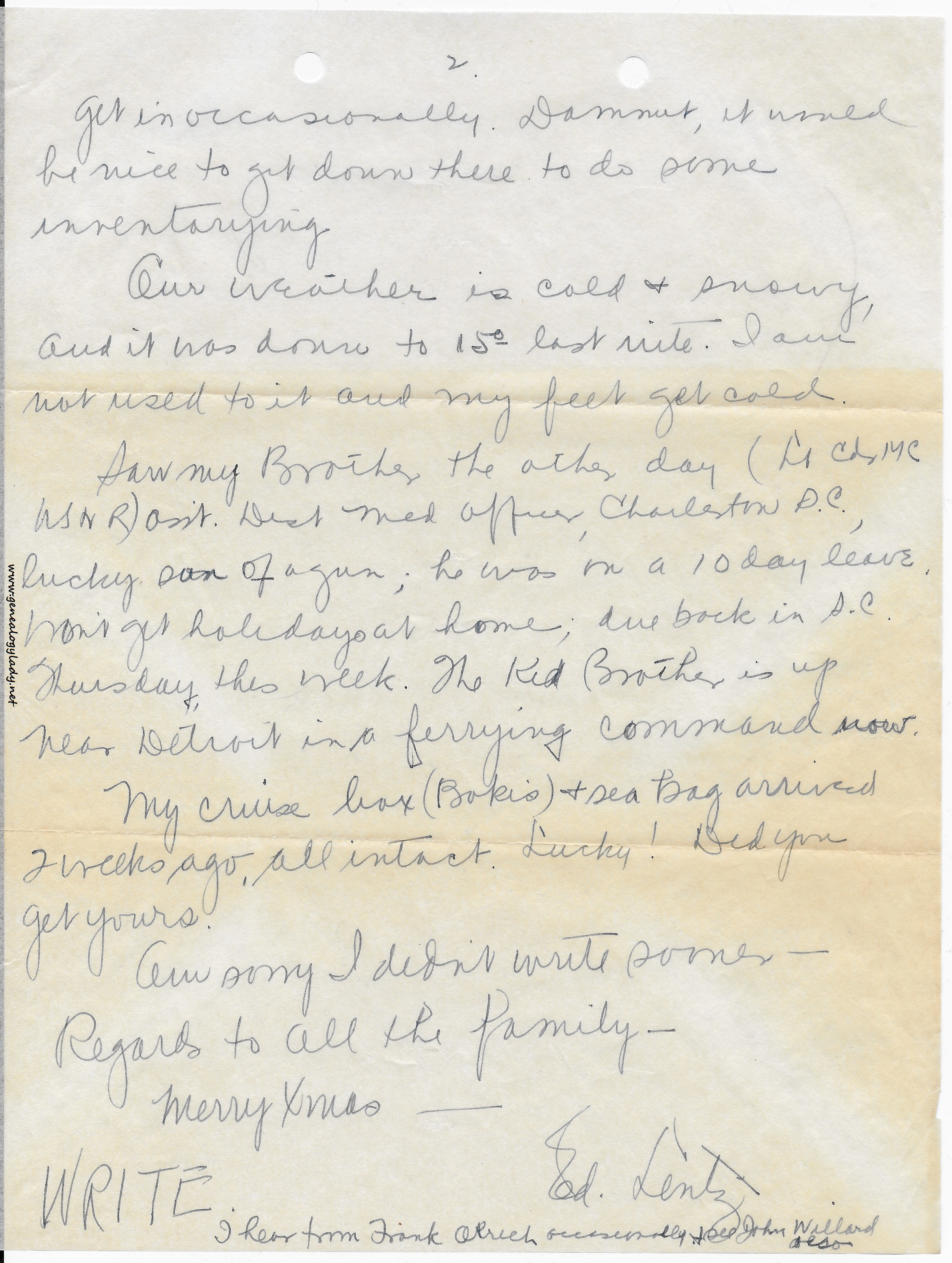[page 2] Haven’t heard any more from anyone. All are poor writers – but never did expect one from Ralph (Help me) Criss. No news about poor Paul Beard. Heard Buster Hyman was at Portsmouth. One [of] the Marines here was at Bonika.