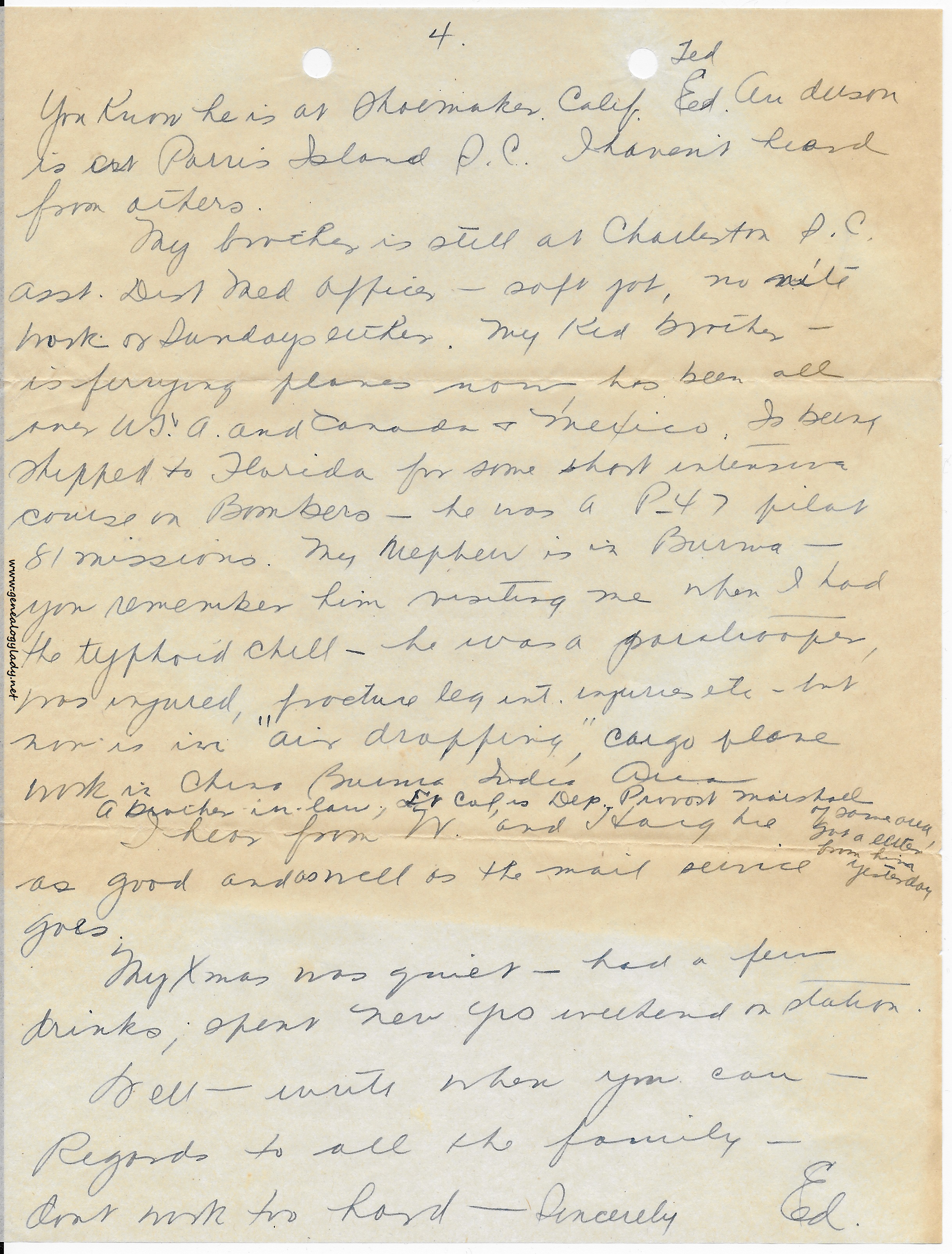 Heard from my bro-in-law – Kunming, China; and my nephew, you met him in Norfolk, has been in Burma since last July – he made paratrooper, was injured, now is in Air Cargo something.