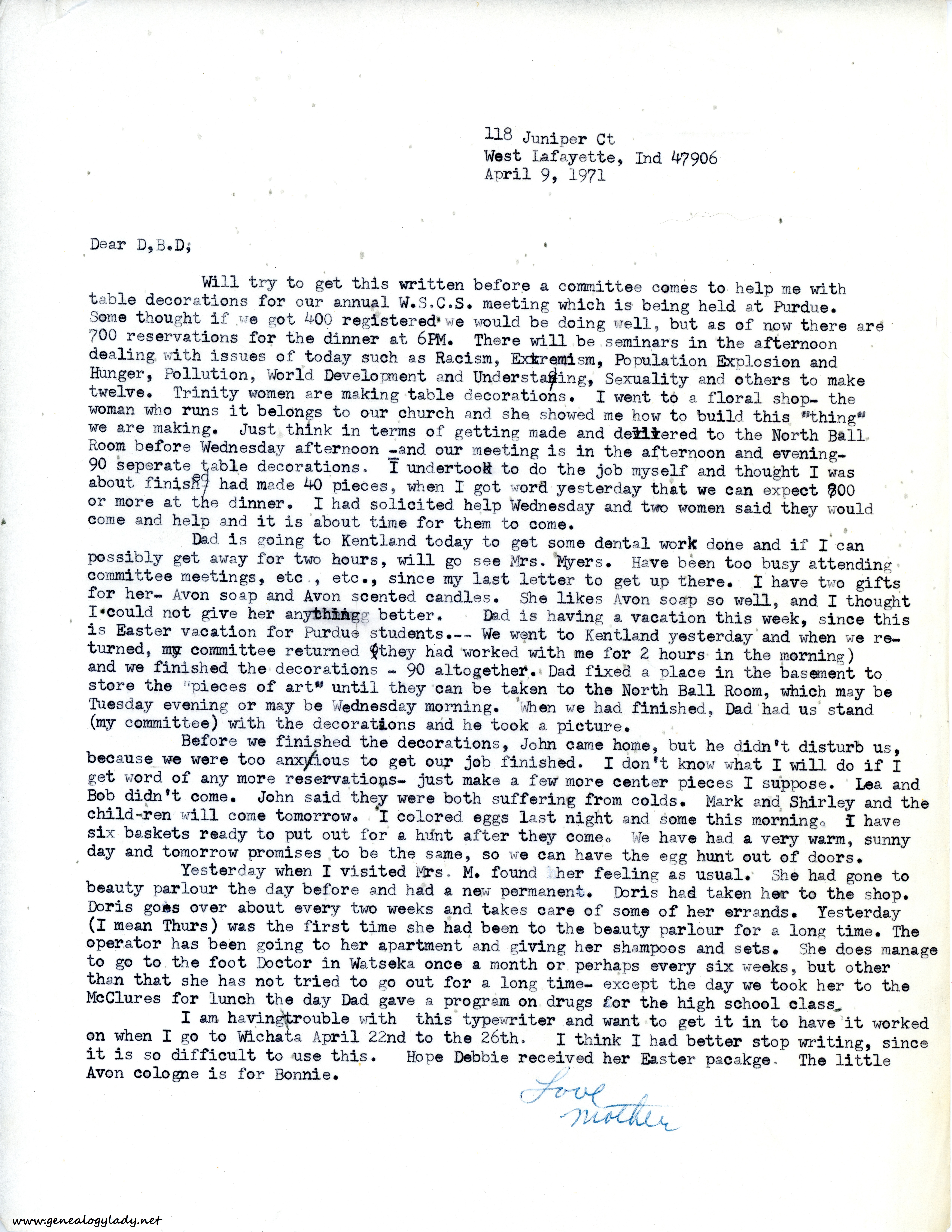 I am having trouble with this typewriter and want to get it in to have it worked on when I go to Wichita April 22nd to the 26th. I think I had better stop writing, since it is so difficult to use this. Hope Debbie received her Easter package. The little Avon cologne is for Bonnie.