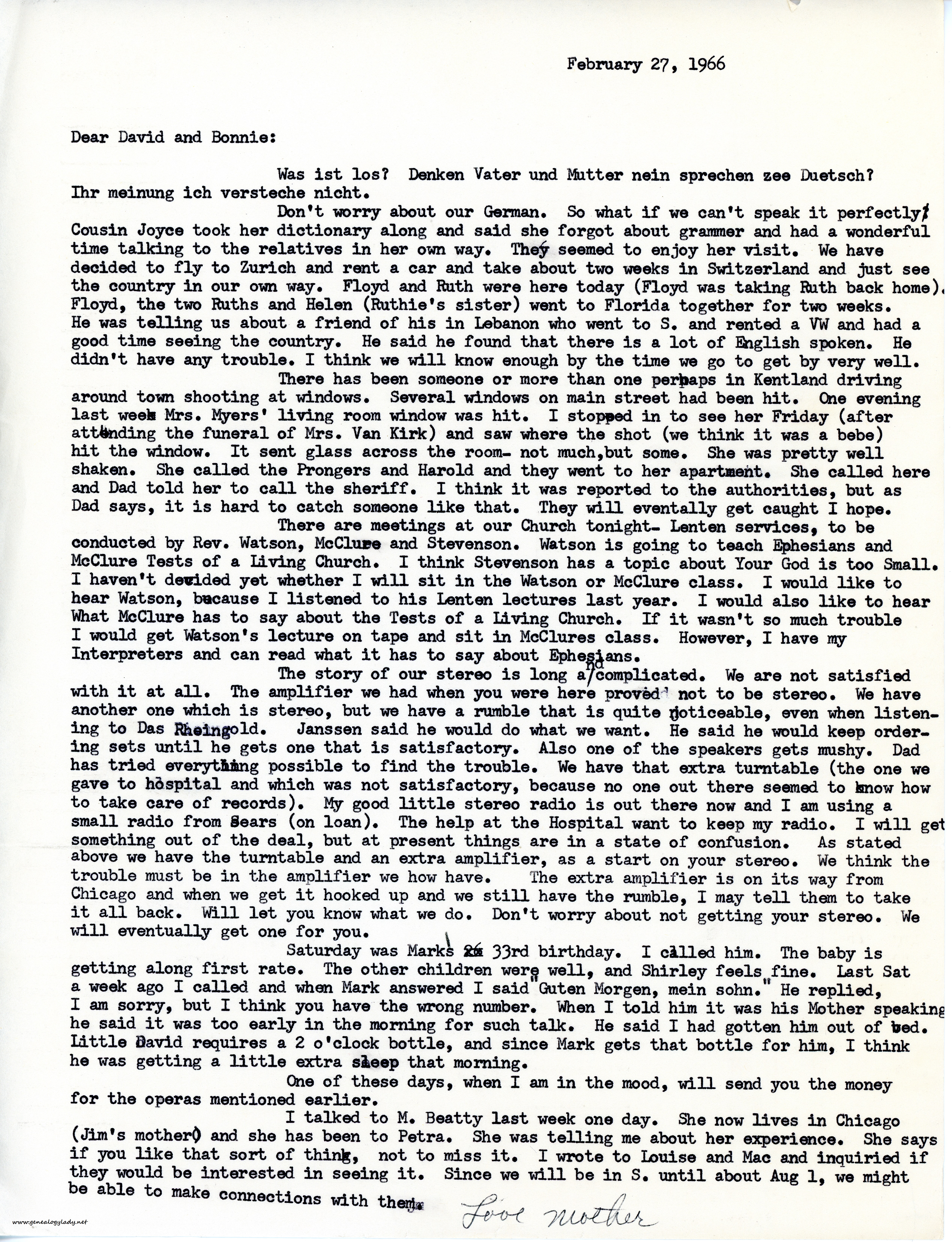 Last weekend we went to Centerville and had a very enjoyable visit with Louise and Mac. We also visited with Grandpa and Grandma. We both think it is remarkable the way Bonnie’s grandparents continue to be so well and active. We enjoyed a steamboat dinner and now Dad is trying to figure how he can make a steamboat. Knowing your Dad, you know he will get something produced in time. Today I attended a luncheon at the Union Building and a Layman’s meeting in Loeb’s Theatre. After the Layman’s meeting I came home, but saw Rev. McClure and a few other people in the lobby before leaving. This week Dad has been attending meetings and I have two more to attend (he has been going to dinner meetings) so we won’t get much done in the way of packing. We plan to go to Kentland Friday evening. He wants Dr. Logan to do some work on his teeth, and he plans to have office hours on Saturday. We plan to go to Danville and meet John, Lea and Bob at about 6:30 for a smorgasbord dinner, then on to John’s to spend the night. We plan to come back home Sunday evening.