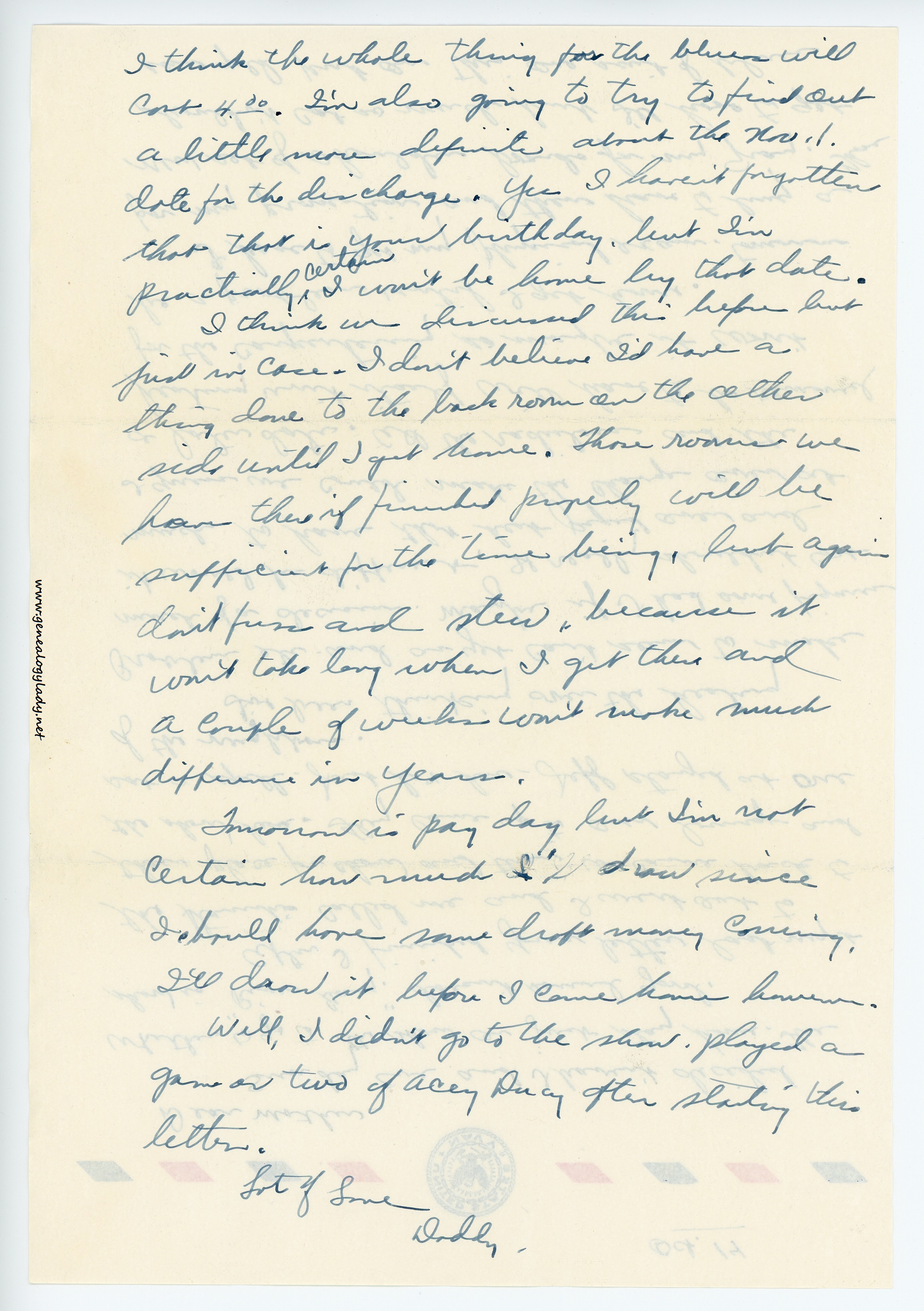 [Editor’s Note: This is the last letter written by Roscoe before he received his separation orders. One would assume that he called Gladys to tell her the good news instead of writing. Included at the end of the letter are three military documents which record his journey home. Roscoe (and Gladys) were meticulous about preserving these documents. Many of Roscoe’s copies of his orders were not included in his military file which is housed at the National Archives. While many WWII personnel files were destroyed in a fire in the early 1970s, the bulk of the Navy’s files were not damaged. Our family has been exceedingly fortunate with a wealth of information regarding Roscoe’s service. While Roscoe and Gladys’ letters are finished, the collection contains several additional letters written by family and friends which I will post over the next few weeks.]