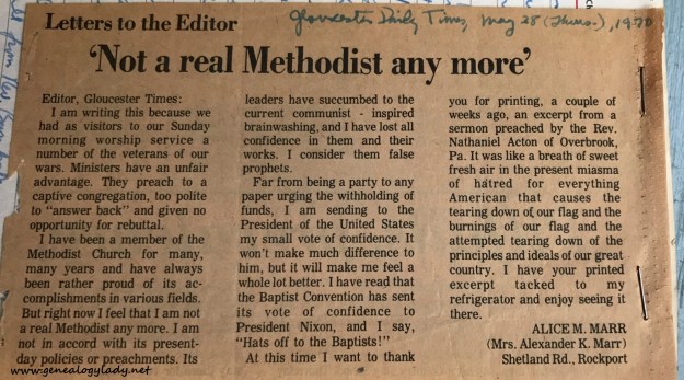 We found ourselves still in bed at 10:00. I had a quick breakfast, then got to work typing—my main concern for the day has been to get the Theological Statement for ordination as nearly done as possible. As of now—12:45 (Fri AM—at night) I have 16 pp typed—it will be about 20 pp. long. I worked on this until our late lunch—shaved before lunch, about 1:00. Then back to the typing—Bonnie went grocery shopping and took Debbie along. I continued typing. About 3:15 I stopped, cut some lilacs for Lucy Patience, then went to see her; I hadn’t called on her in many weeks. I stayed until about 4:15, came home, had a small snack—then back to the typing—until the newspaper came, which contained the letter which is attached to this page—Alice Marr’s reaction to my last two sermons. [See below] I can’t say that I was upset, but it is rather stunning—and distracting—it was hard to keep my mind on other things. We had supper about 6:30, watched CBS news. At 7:30 I returned to typing—had a phone call from Rev. Bamforth re: Alice Marr’s letter—he wanted to assure me [of] his support and encouragement. 8:30–10:15 we spent with Patriquins. When we came home I returned to typing—worked til after 12:30. Stopped to bathe; OBLO, 1:20