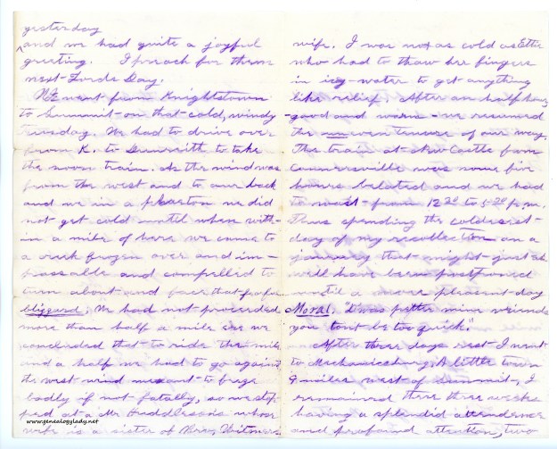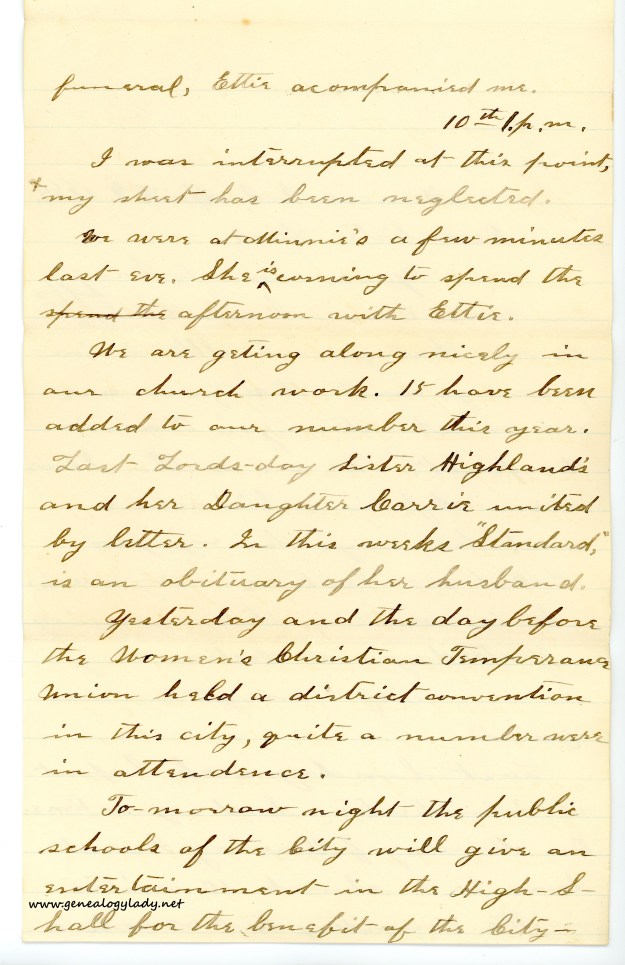I wanted to make sure I commented on the news Aunt Martha sent us. After finding her last letter stashed away in Mother’s desk drawer, I returned to my writing spot. At seventy-nine, my grandfather still managed to do some work on his farm. He also rides daily into town to reminisce with his war buddies at the local tavern. We are all worried about my grandmother. Although a few years younger than Grandfather, her health has been poor the last few years. We anticipate receiving the news of her passing within the next few months. I will miss her and her apple pies.