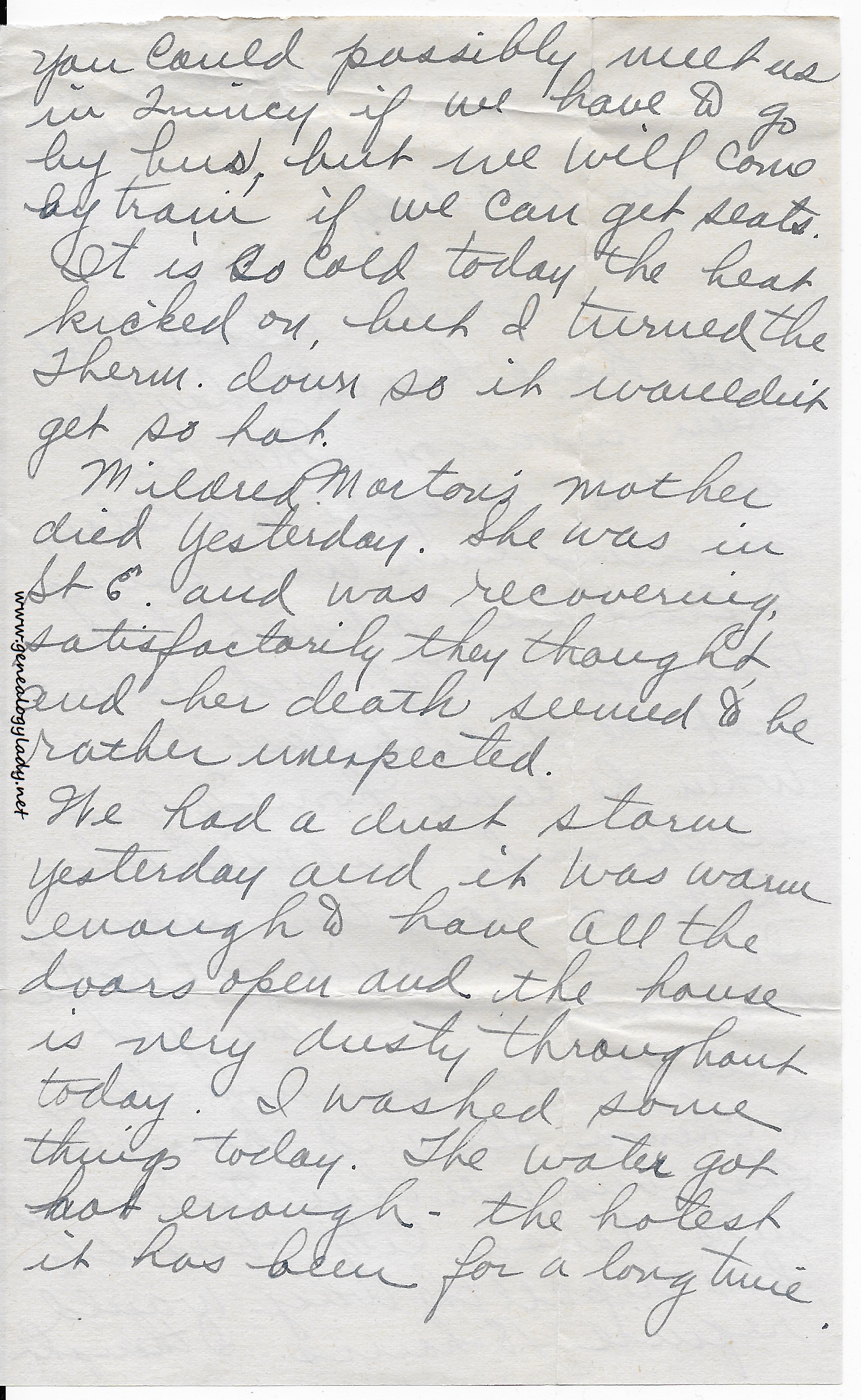 Mildred Morton’s mother died yesterday. She was in St. E. and was recovering, satisfactorily they thought, and her death seemed to be rather unexpected.