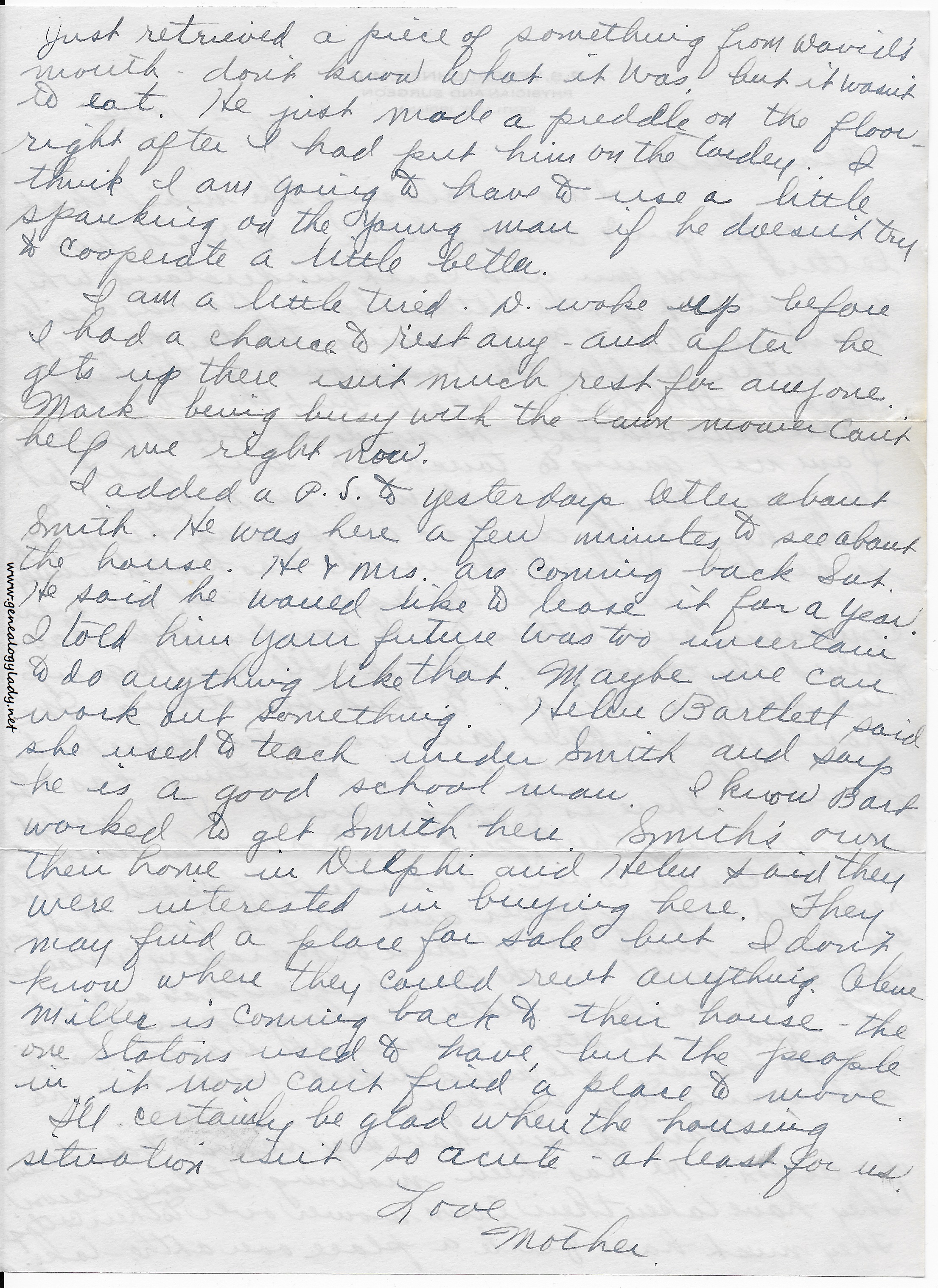 – – – It’s 3 p.m. and in about half an hour J. & M. will be home from school. The school time has been changed – 8:30 a.m. instead of 9 and they get out earlier. I haven’t done much today except odds and ends. I think we will have to clean out the furnace this evening. It is warm enough today to let the fire go out. – – Just went out to check up on David – he was over on Staton’s porch with Martha, so I made him come in. Maybe I am being a little too severe on him but I want him to learn a few rules.