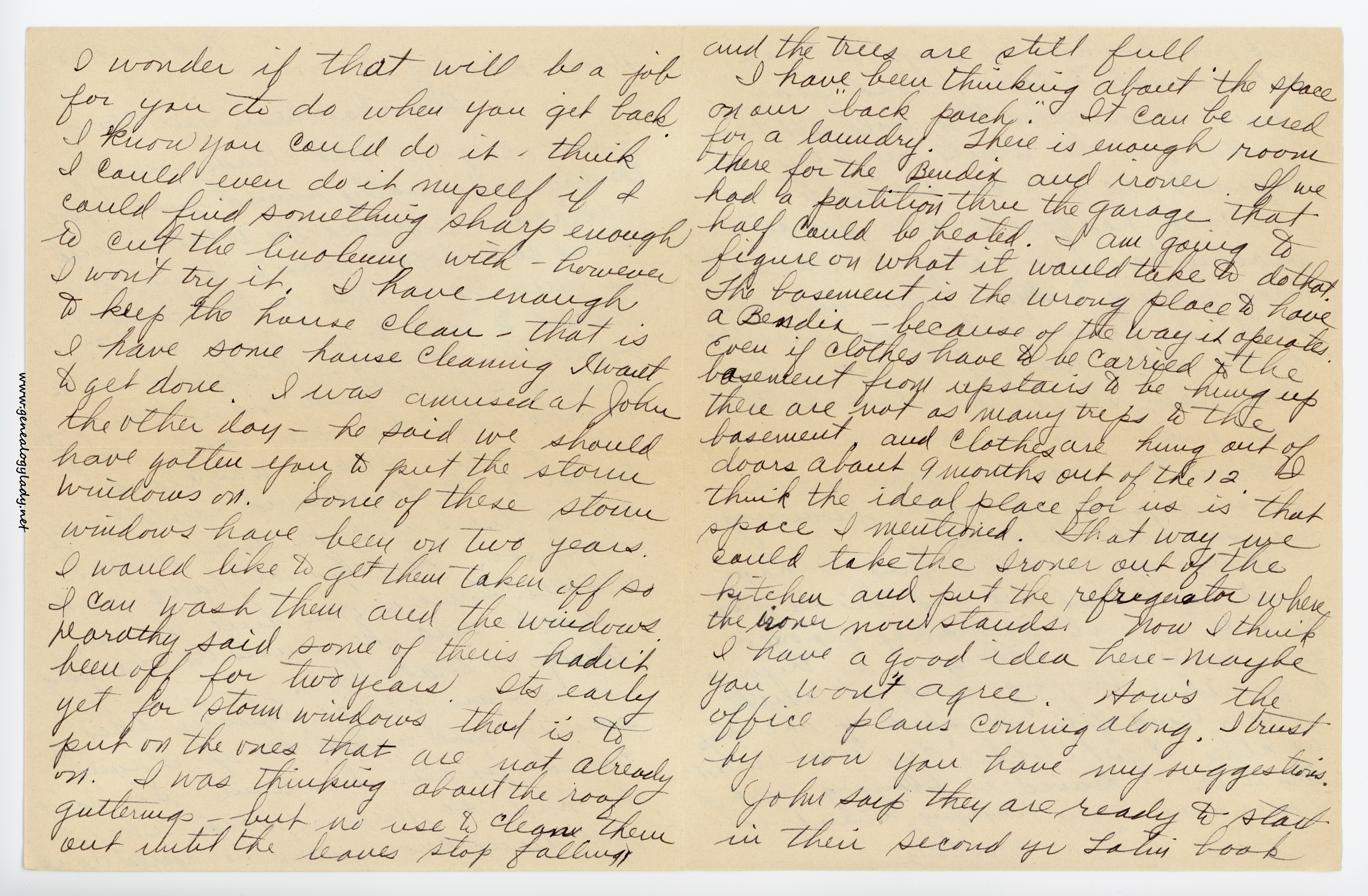 Yours of Oct. 1 came with your latest office plans. I think that is a better model than with a hall thru the center. I think I’ll go down and get the exact measurements before Nick & Dorothy go away. There are to go Fri. or Sat. to Bill’s lodge for the weekend. Since you aren’t sure about the trip to G.L. I’ll keep on writing until I get word you are on your way. I have been thinking how convenient it would be it you would get a trip about the time the points are lowered to your figure.