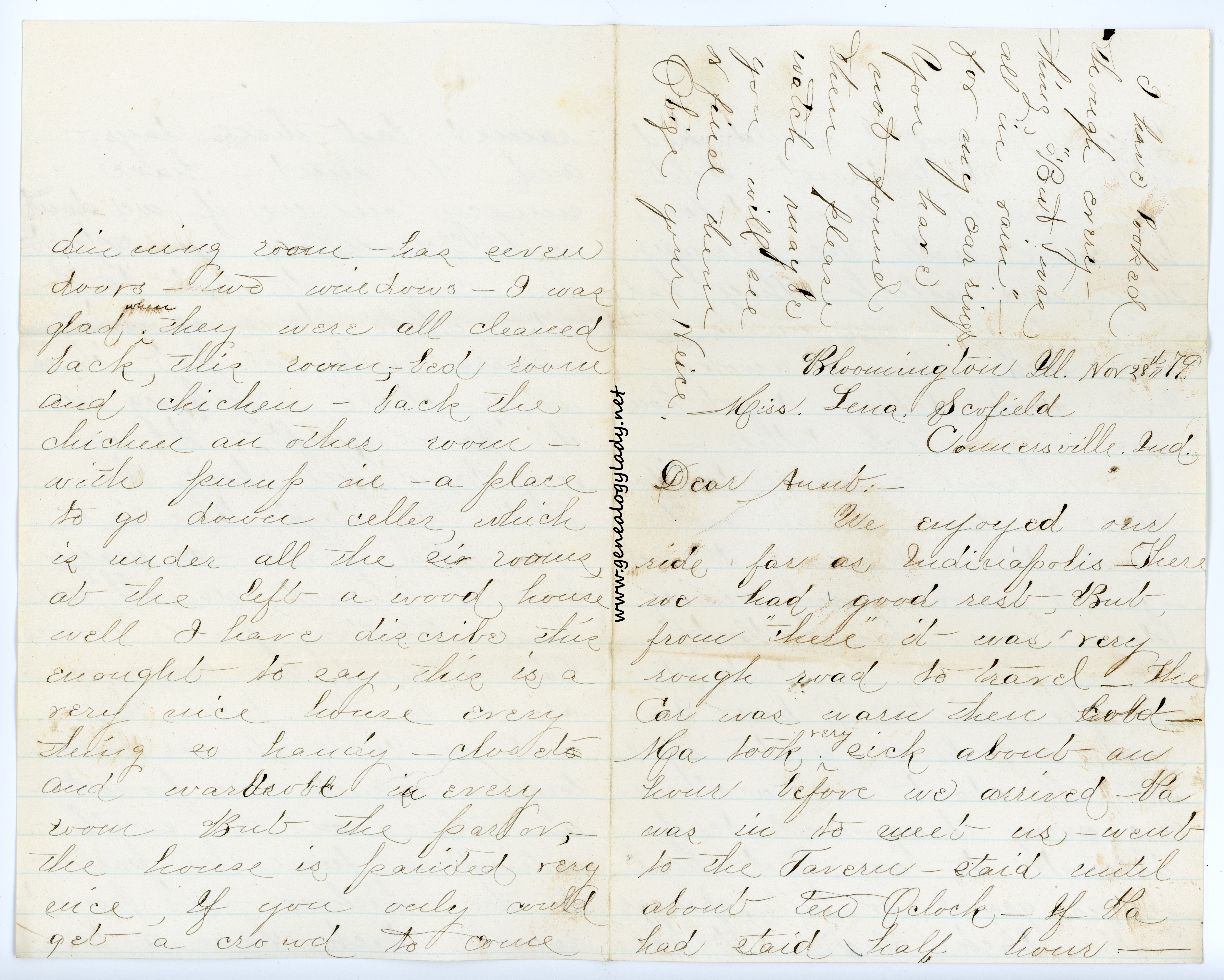 We enjoyed our ride far as Indianapolis—There we had good rest, But from “there” it was very rough road to travel—The car was warm then cold—Ma took very sick about an hour before we arrived—Pa was in to meet us—went to the Tavern—staid until about ten o’clock—If Pa had staid half hour—