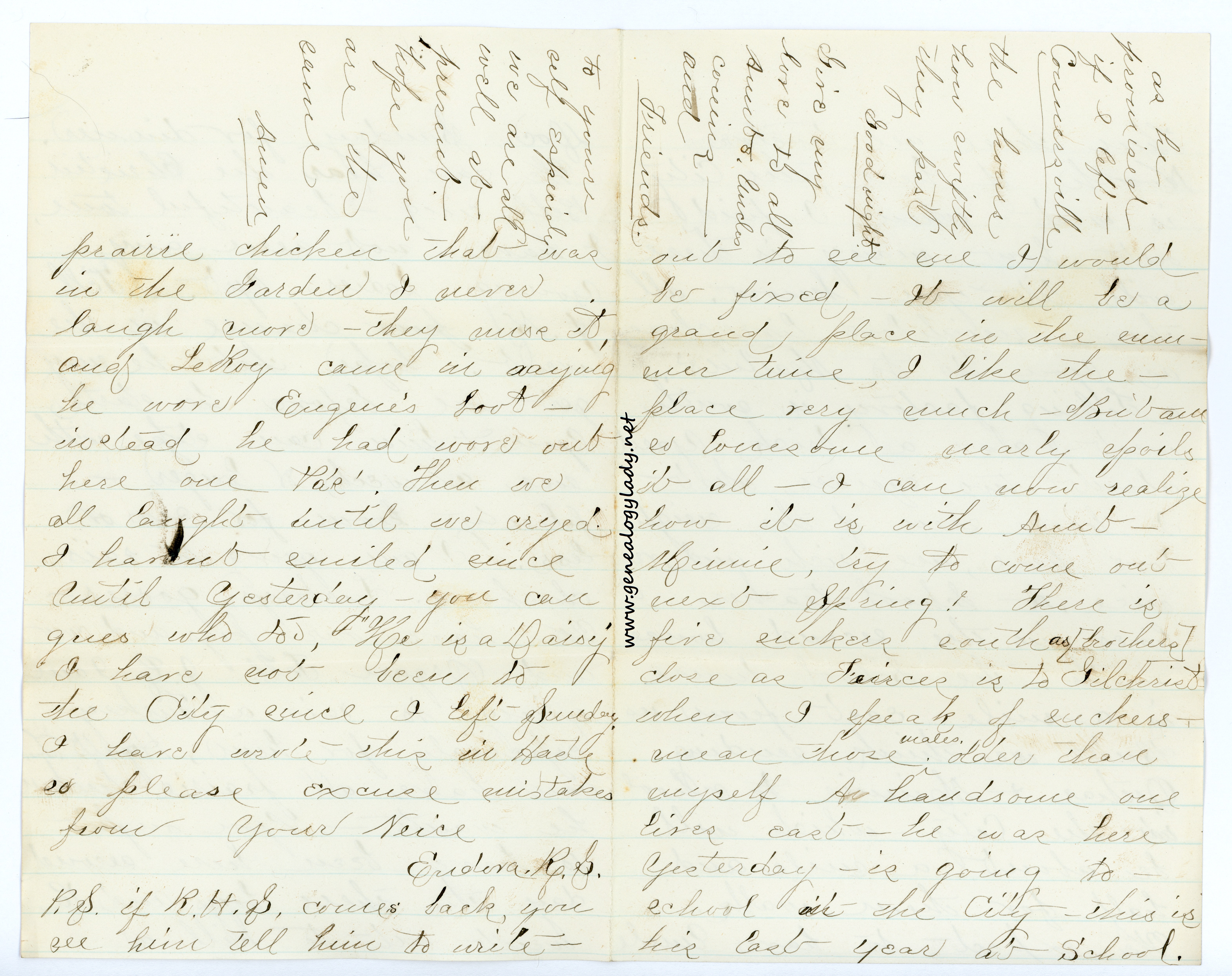 [page 8] prairie chicken that was in the Garden I never laugh more—they m[?] it, and LeRoy came in saying he wore Eugene’s boot—instead he had wore out here one Pa’s. Then we all laught until we cryed. I haven’t smiled since until yesterday—you can gues who to, “He is a Daisy” I have not been to the City since I left Sunday. I have wrote this in Haste so please excuse mistakes from your Neice