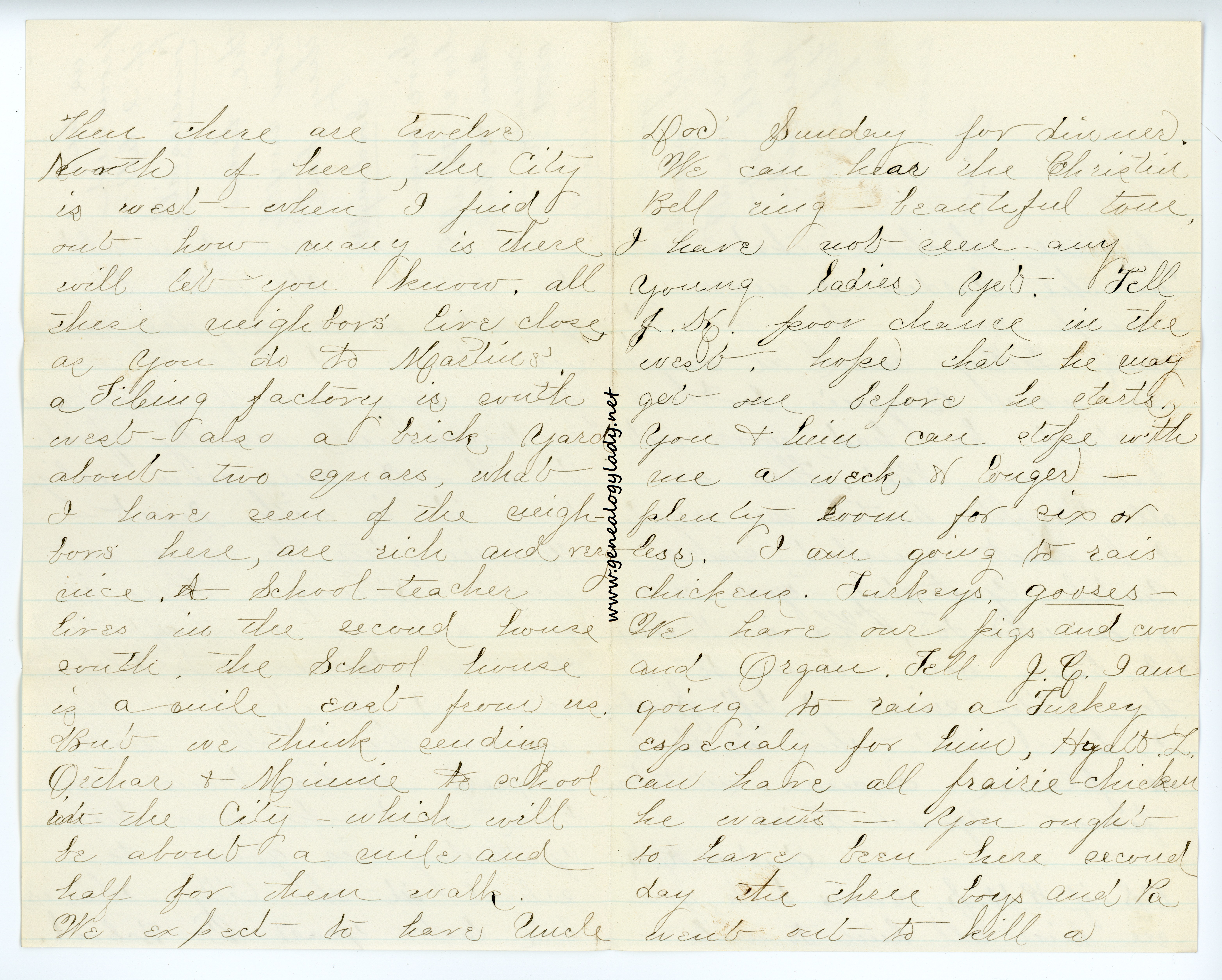 [page 7] Doc Sunday for dinner. We can hear the Christin Bell ring—beautiful tone. I have not seen any young ladies yet. Tell J. S. poor chance in the west. Hope that he may get one before he starts. You & him can elope with me a week or longer.—plenty room for six or less. I am going to rais chickens. Turkeys, gooses—We have our pigs and cow and Organ. Tell J. S. I am going to rais a Turkey especially for him, Hyatt L. can have all prairie-chicken he wants—You ought to have been here second day the three boys and Pa went out to kill a