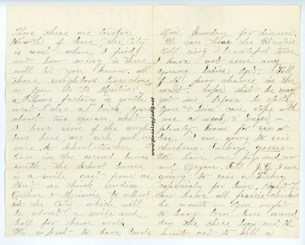 [page 6] Then there are twelve North of here, the city is west—when I find out how many is there will let you know. All these neighbors live close, as you do to Martins’. a Tileing factory is south west—also a brick yard about two equars, what I have seen of the neighbors here, are rich and very nice. A school teacher lives in the second house south. The school house is a mile east from us. But we think sending Arthar & Minnie to school in the City—which will be about a mile and half for them walk. We expect to have Uncle