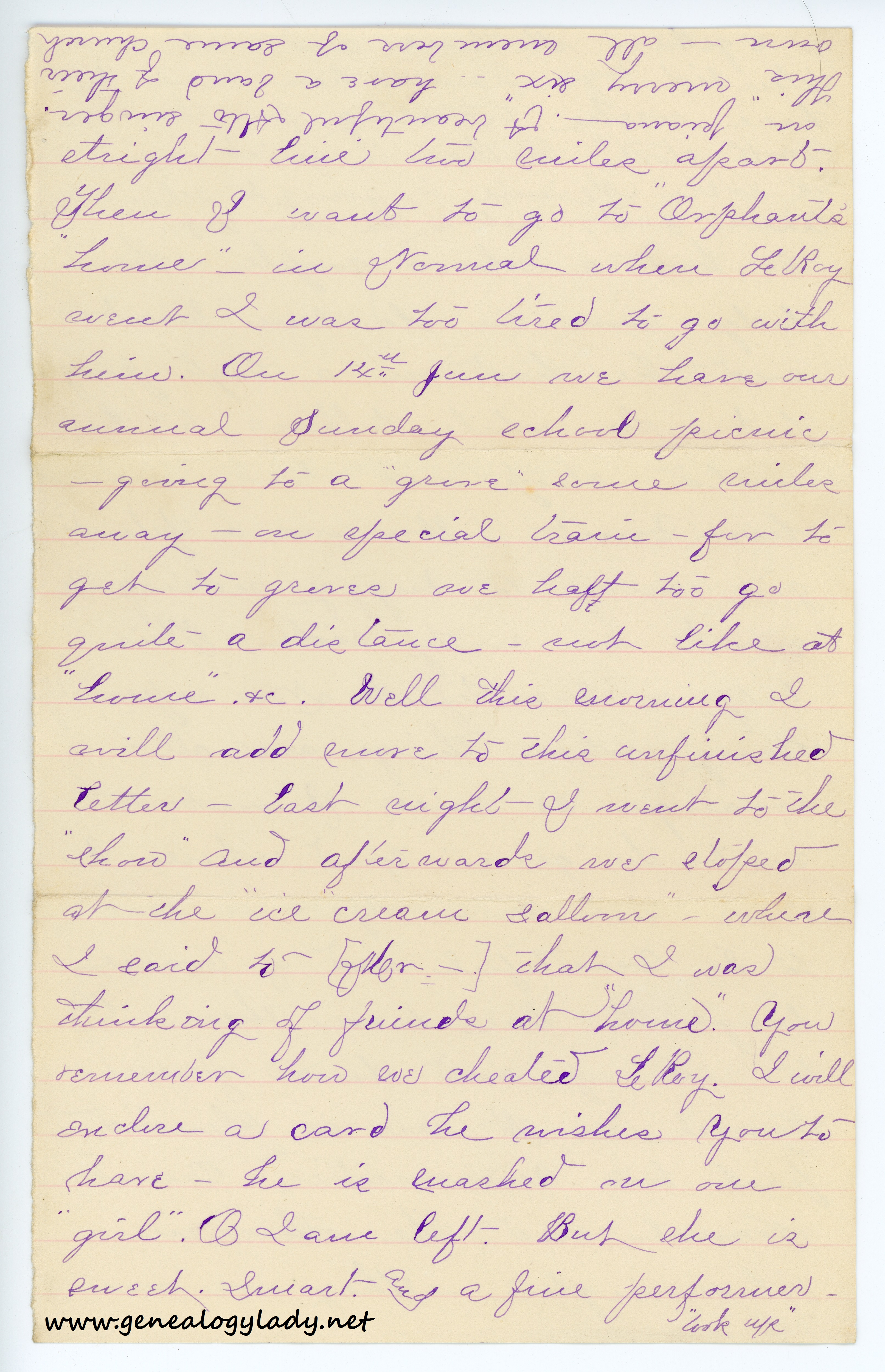 [page 6] stight line two miles apart. Then I want to go to “Orphant’s home”—in Normal when LeRoy went I was too tired to go with him. On 14th Jun we have our annual Sunday school picnic—going to a “grove” some miles away—on special train—for to get to groves one haft too go quite a distance—not like at “house” &. Well this morning I will add more to this unfinished letter—last night I went to the “show” and afterwards we stoped at the “ice cream sallon”—where I said to [Men] that I was thining of friends at “home.” You remember how we cheated LeRoy. I will enclose a card he wishes you to have—he is [?] on one “girl.” O I am left. But she is sweet. Smart and a fine performer—“look up”