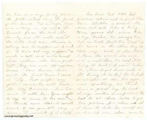 [page 3] I’ve have had little Tad picture taken and is just like him. Thaddie is smart—he does not act like a baby three years old—more like a boy twelve. He always his hat on back part his head and he came in the other day in that way—said to Ma [Can I have the can?] Ma said not a word, then he said, [I’ll bring it back!] [I won’t brake it, when I get done with it I’ll bring it back.] He looked so straight at Ma, his eyes were sparkling. We think him a great boy. He must always walks so important. He had to sit three times to get his picture, for when we asked him to look, he would raise on his tip toes. When ever he