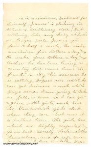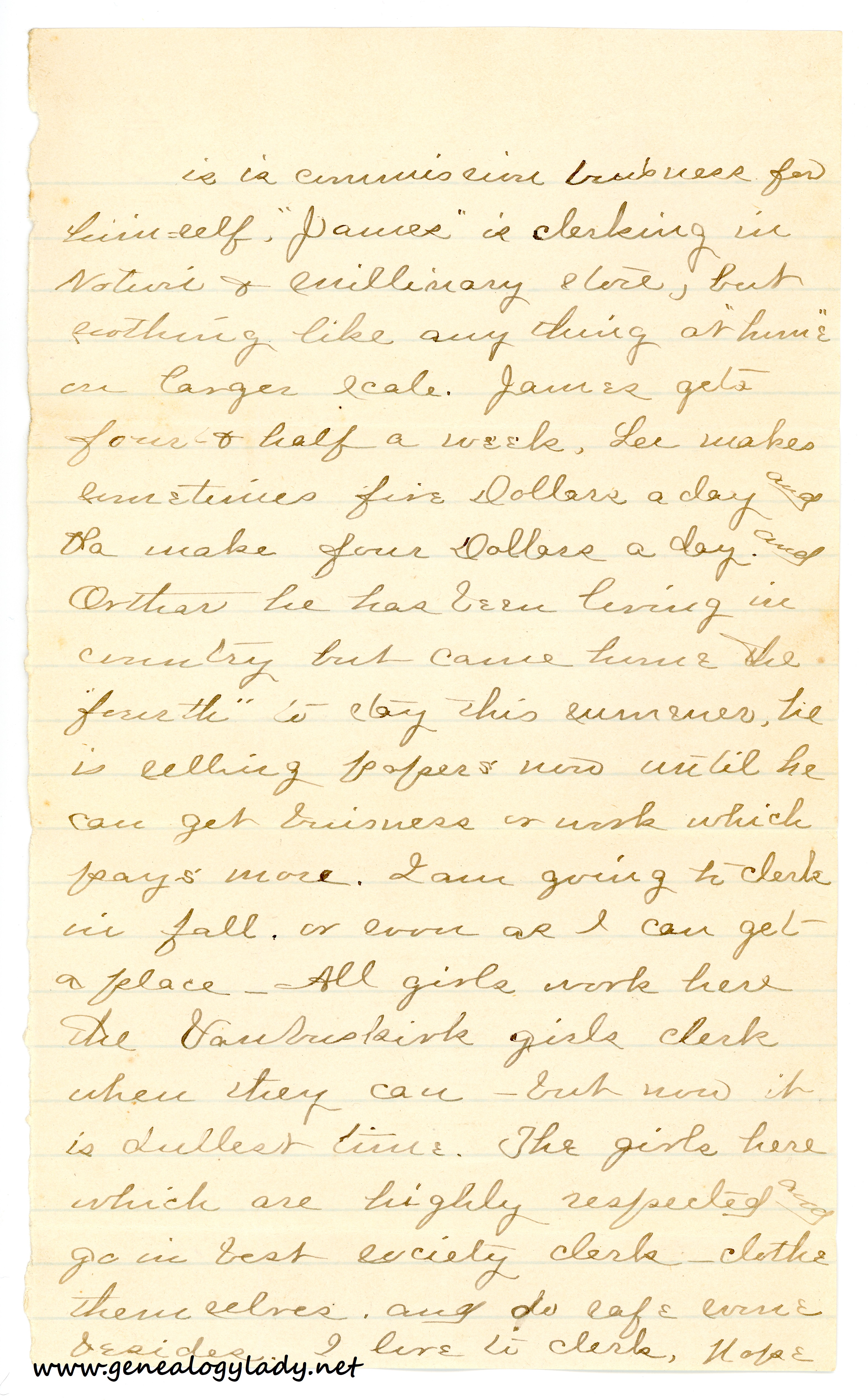 [page 6] is is commission business for himself. “James” is clerking in Notion & Millinary store, but [?] like any thing at “home” on larger scale. James gets four & half a week. Lee makes sometimes five dollars a day and Pa make four dollars a day and Arthur he has been living in country but came home the “fourth” to day this summer, he is selling paper & now until he can get business to work which pays more. I am going to clerk in fall or soon as I can get a place—All girls work here the Vanbuskirk girls clerk when they can—but now it is dullest time. The girls here which are highly respected and go in best society clerk—clothe themselves and do safe some besides. I live to clerk. Hope