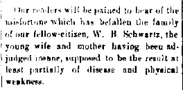 “Mrs. W. B. Schwartz,” Clay County Enterprise (Brazil, Indiana), 7 January 1891, p. 1, col. 1; digital image, Newspaper Archive (http://www.newspaperarchive.com : accessed 2 February 2014).