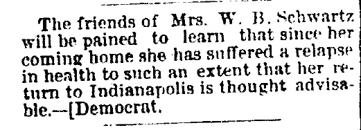 The friends of Mrs. W. B. Schwartz will be pained to learn that since her coming home she has suffered a relapse in health to such an extent that her return to Indianapolis is thought advisable. – [Democrat.
