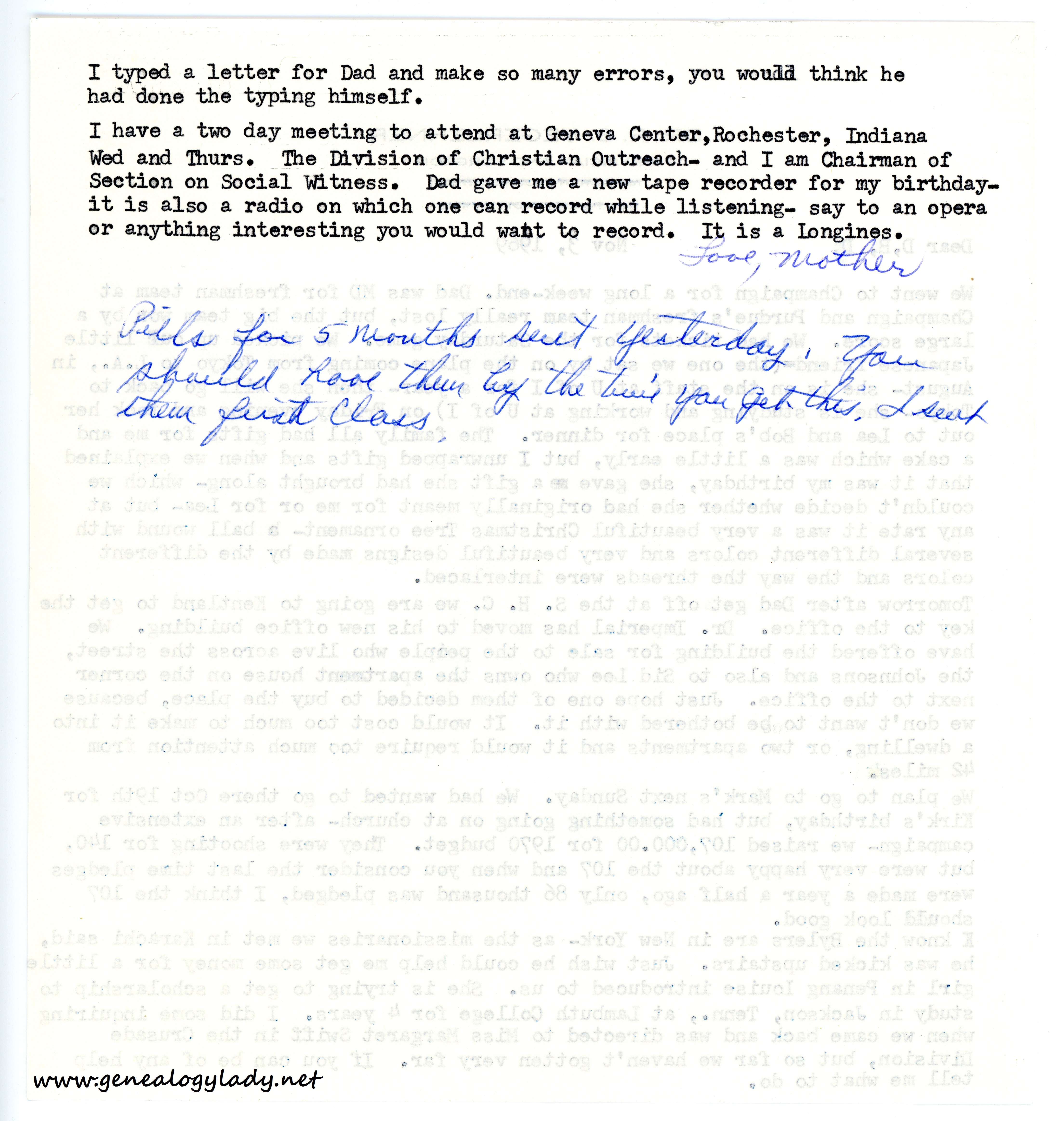 I have a two day meeting to attend at Geneva Center, Rochester, Indiana, Wed. and Thurs. The Division of Christian Outreach – and I am Chairman of Section on Social Witness. Dad gave me a new tape recorder for my birthday – it is also a radio on which one can record while listening – say to an opera or anything interesting you would want to record. It is a Longines.