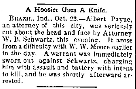 Yesterday afternoon and evening seem to be set apart for general altercations among a few of our prominent citizens. At about 4 o’clock Attorney W. B. Schwartz engaged in a quarrel with W. W. Moore, of the firm of Moore and Ferguson, over some accounts which ended in a hand-to-hand combat. Friends interrupted and prevented serious damage. Mr. Schwartz, late in the evening, came in contact with attorney Albert Payne, and a quarrel was precipitated at once, which resulted in a fight. Schwartz was promptly knocked down, but during the melee he whipped out a knife and cut Mr. Payne about the head and face, also stabbing him in the back, but the latter wound is of no consequence, as his heavy clothing prevented the blade from entering the body. We are informed that friends were holding Mr. Payne when the cutting was done. The gash in the face is more serious, reaching from the forehead to the lower extremity of the nose, and while not considered dangerous, will leave an ugly scar for life.