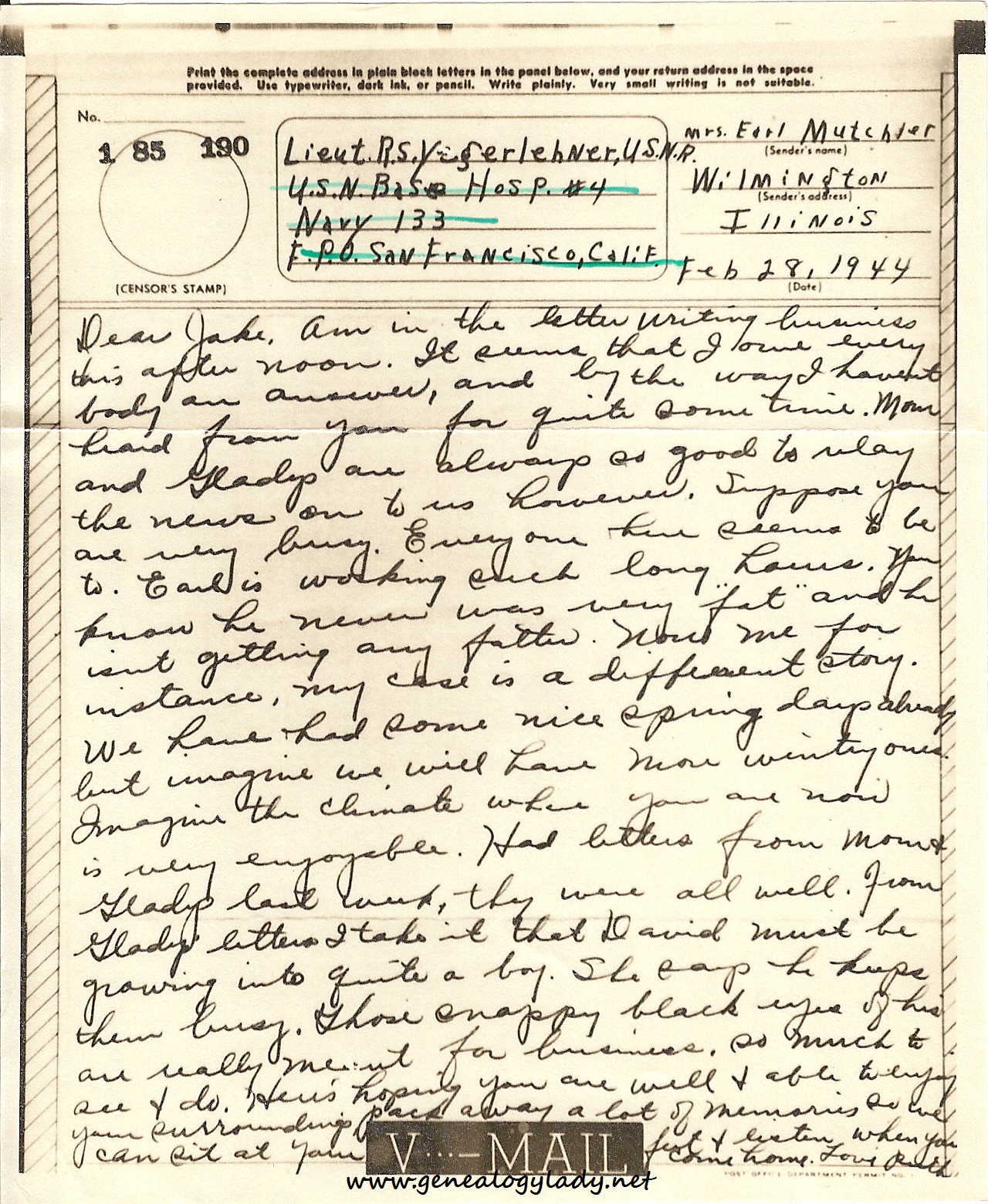 Mark is waiting to take this to the P.O. & get the paper – no more home deliveries. Mark gave me a cute little card & a package of v-mail for my birthday.