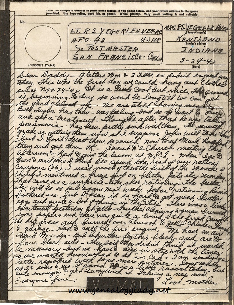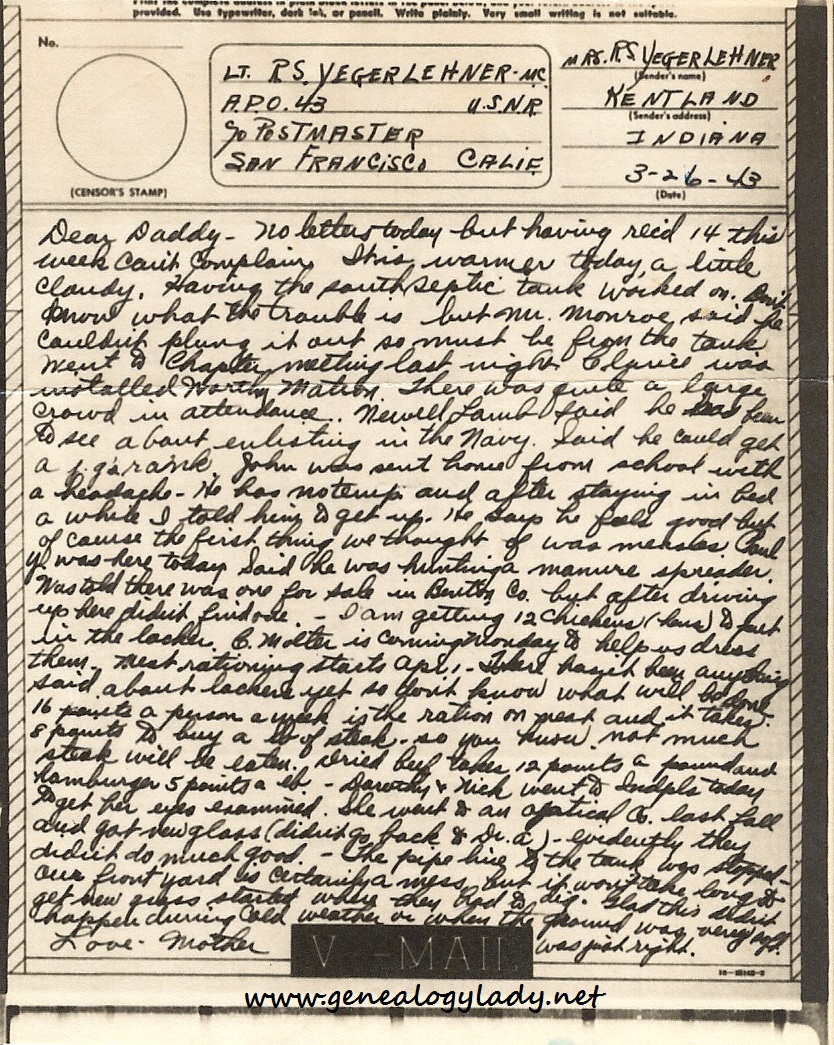I am planning to go to the hospital again tomorrow and intend to bring Dora Diedam home for the week-end. She is a grad. now & works in O.B. She was on 3rd north just around the corner from Mother’s room but she was changed to 4th . Alice is in training now and Dora told her if she intended to smoke and do things Dora hadn’t done while in training she couldn’t come down there. There are three Kentland girls there in the new class: Mary Tuberty, Alice D. and Joan Hall. The hospital is so short of help they are going to put the new class on the floors as soon as they can get their uniforms. The maids have to help with patients sometimes now. Mentioning the uniforms makes me think of the cotton goods shortage on the market now. I tried to buy shirts for John and Loeb’s only had rayon at $2.50 ea. I got two shirts, at B. & B. and they fit except for the arms (sleeves) & John’s arms are so long. I am