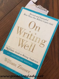 I received a great recommendation for a book this week—On Writing Well by William Zinsser. The 30th anniversary edition includes a chapter on writing family history (which I haven’t read yet). I believe the book is helping my brain make this transition from researching to putting pen to paper (or fingers to the keyboard). Writing is such an important part of the portfolio (or the job of being a genealogist). Learning to write well should be an integral part of any genealogist’s education plan. I have read my share of absolutely boring family histories. I do not want to be one of those family history writers who strings a bunch of facts with footnotes together to make a narrative. I want to breathe life into my ancestors! Finding a balance between sound technical genealogical writing and entertaining family narrative is my goal. A couple take-a-ways from the book so far:
